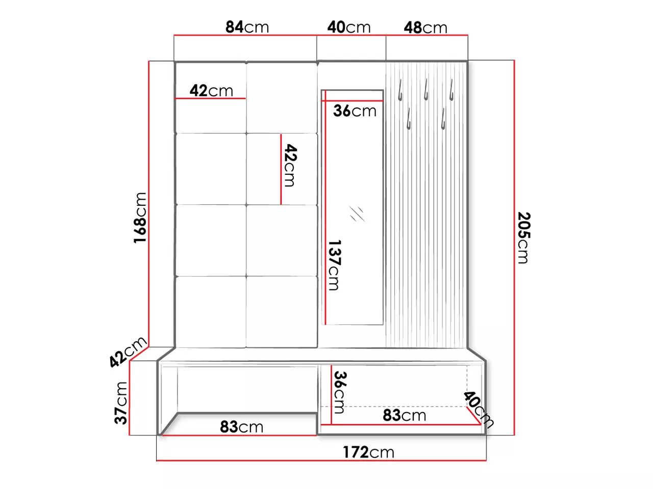 - nástěnný panel se zrcadlem a věšáky: 80/168 cm