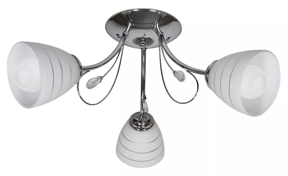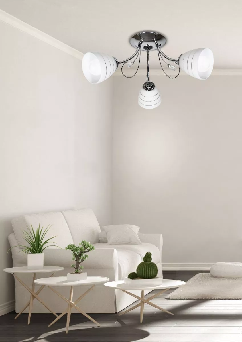 Stropní přisazený tříramenný lustr SIMPLI je populární svítidlo s klasickým designem v lesklém chromovaném provedení. Svítidlo je osazeno skleněnými stínidly v bílé barvě. Mezi dekorativní prvky dále patří jemně prohnuté kovové části a čiré krystalky, které celku dodávají jedinečný vzhled. Svítidlo je určeno pro 3 žárovky s paticí E27 a maximálním výkonem 40 W. Pro úsporu el. energie doporučujeme osadit úspornou LED žárovkou. Krytí IP20 značí vhodnost použití v interiéru.