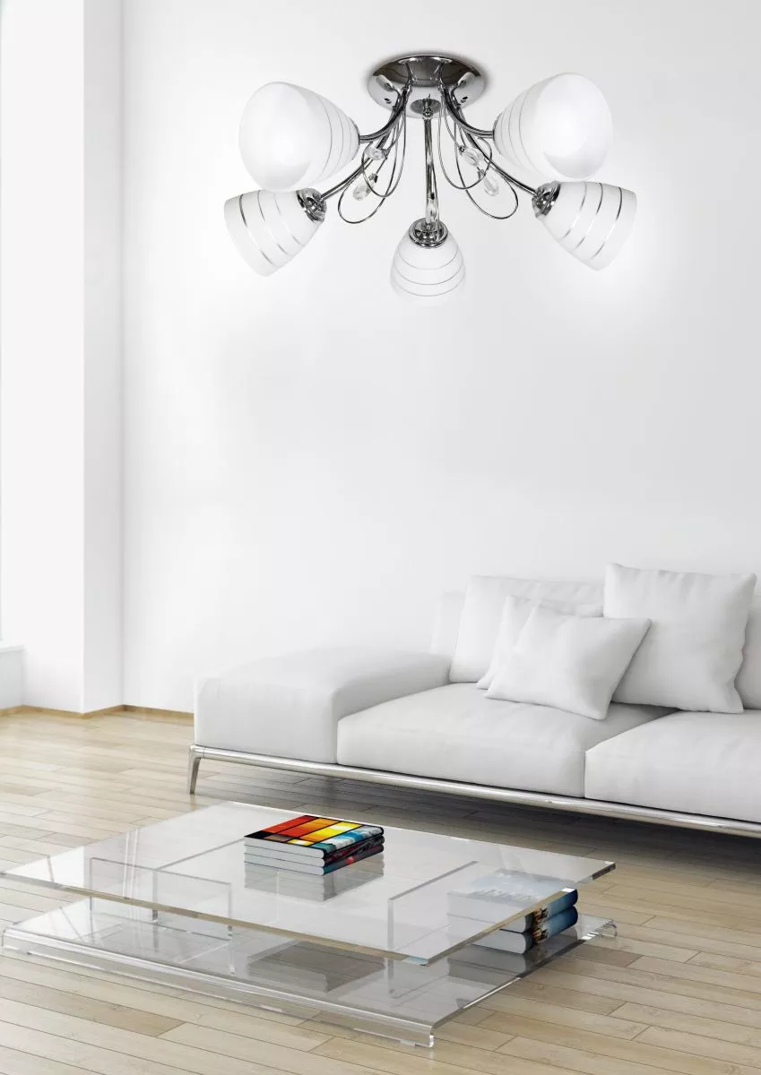 Stropní přisazený pětiramenný lustr SIMPLI je populární svítidlo s klasickým designem v lesklém chromovaném provedení. Svítidlo je osazeno skleněnými stínidly v bílé barvě. Mezi dekorativní prvky dále patří jemně prohnuté kovové části a čiré krystalky, které celku dodávají jedinečný vzhled. Svítidlo je určeno pro 5 žárovek s paticí E27 a maximálním výkonem 40 W. Pro úsporu el. energie doporučujeme osadit úspornou LED žárovkou. Krytí IP20 značí vhodnost použití v interiéru.