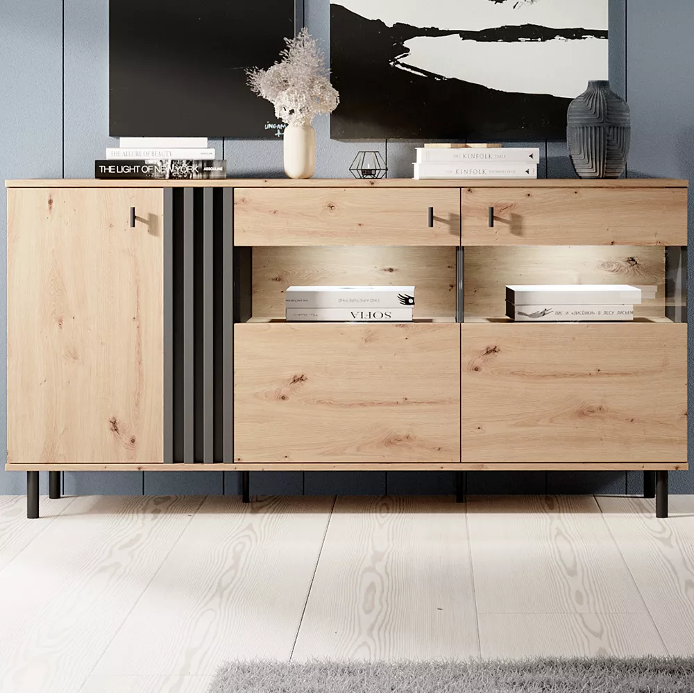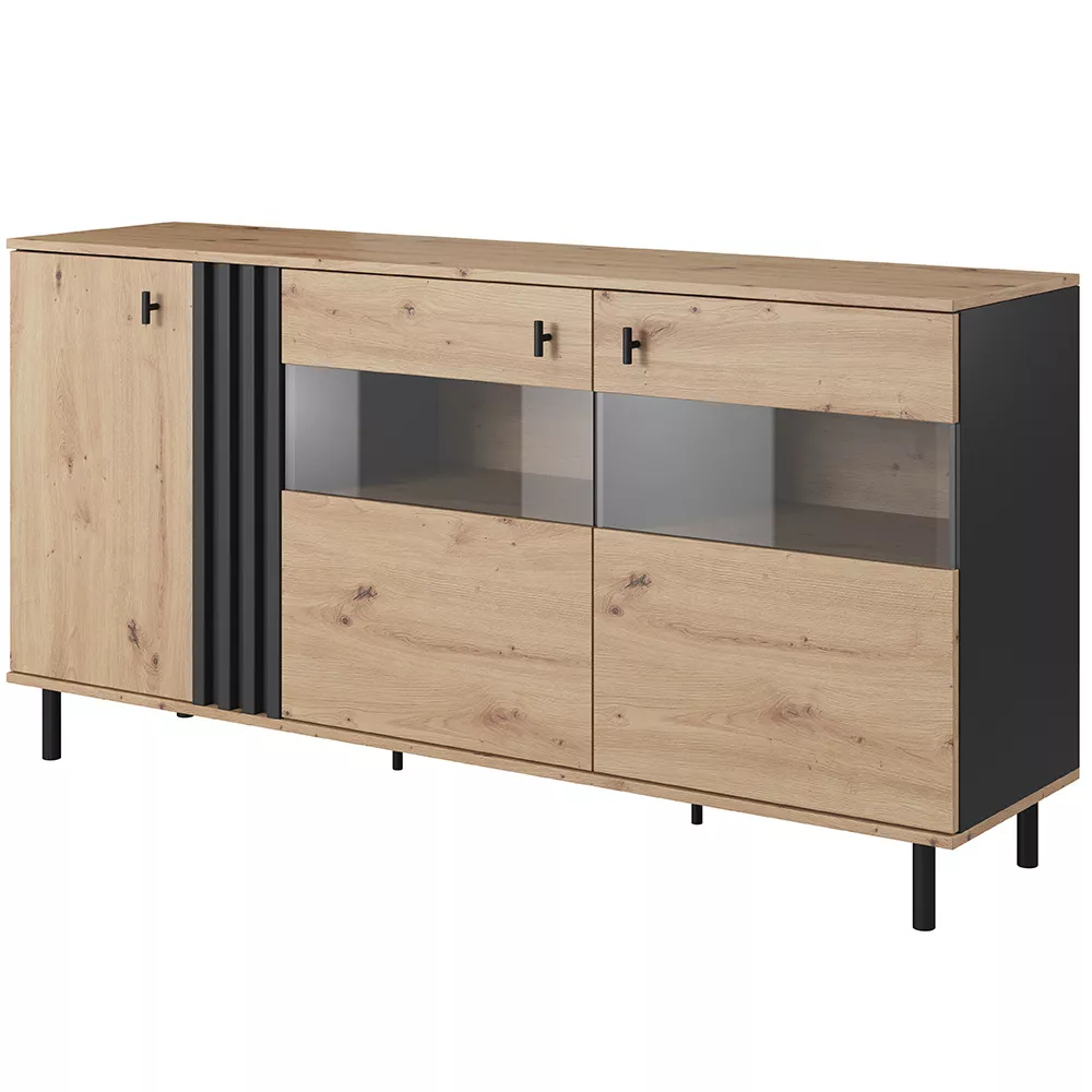 Prosklená kombinovaná komoda CHATOM zaujme na první pohled kontrastem dekoru dubu artisan a elegantní antracitové barvy, který podtrhuje moderní výraz celé komody. Decentní lamely, svislé úchytky vyrobené na míru a černé kovové nohy vytvářejí harmonii tvarů a lehkost. Komoda nabízí nejen styl, ale i praktické řešení pro uložení věcí. Volitelné LED osvětlení dodá komodě atraktivní a jemně osvětlený vzhled.