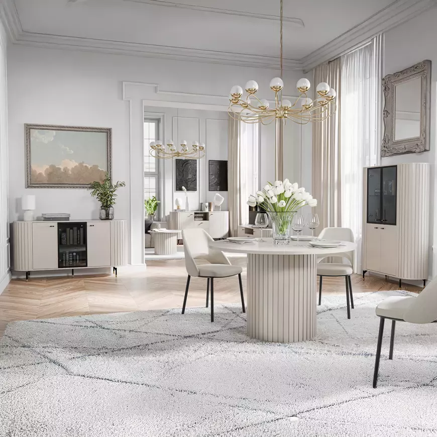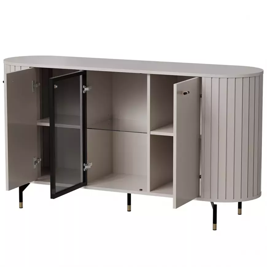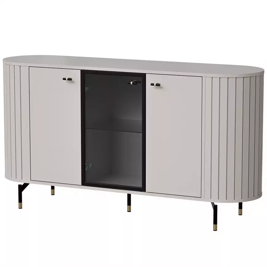 Komoda s prosklenými dvířky APEX spojuje luxusní vzhled s praktičností. Komoda nabízí místo na dokumenty, suvenýry i dekorace. Zdobení v podobě lamel zaujme na první pohled a přidává nábytku jedinečný styl.