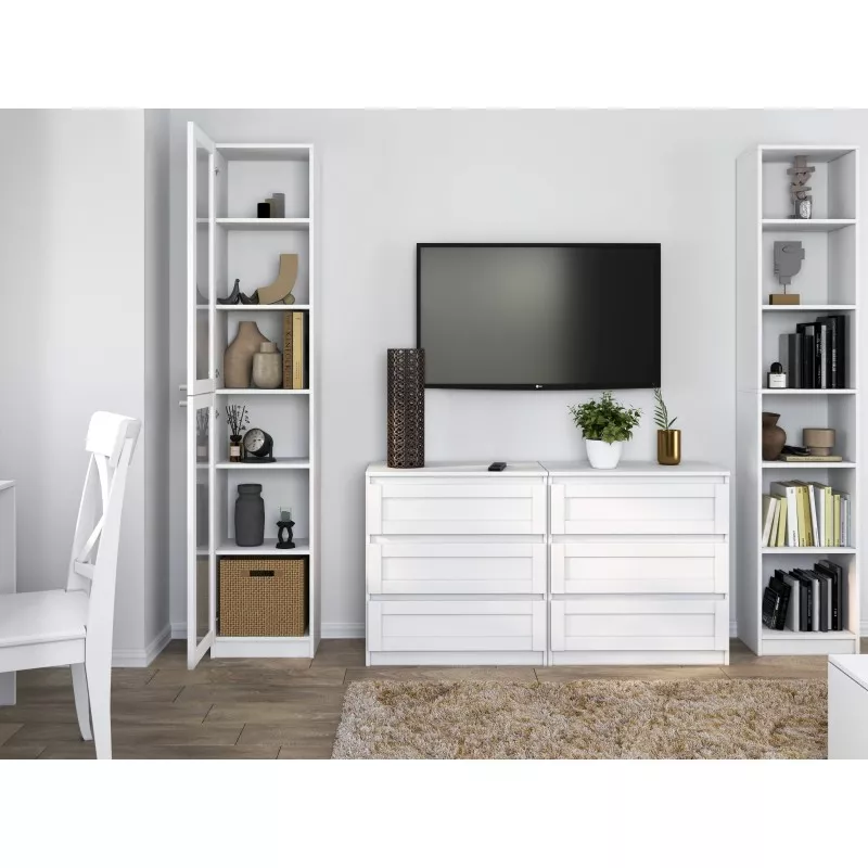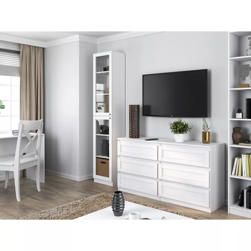 Úzká vysoká vitrína TAMBET 1 je vynikající volbou pro uložení porcelánových setů, knih, kancelářských doplňků a dalších předmětů. Díky svému klasickému designu se perfektně hodí do různých stylů interiéru, od moderních kanceláří až po tradičně zařízené obývací pokoje.