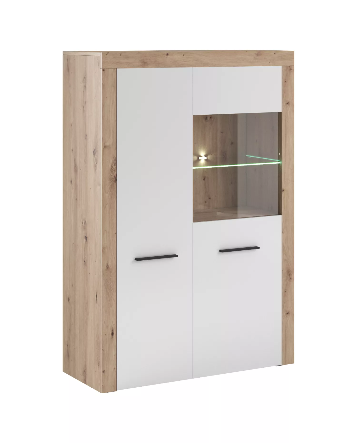 Nízká vitrína s LED osvětlením WYLIE - dub artisan / lesklá bílá