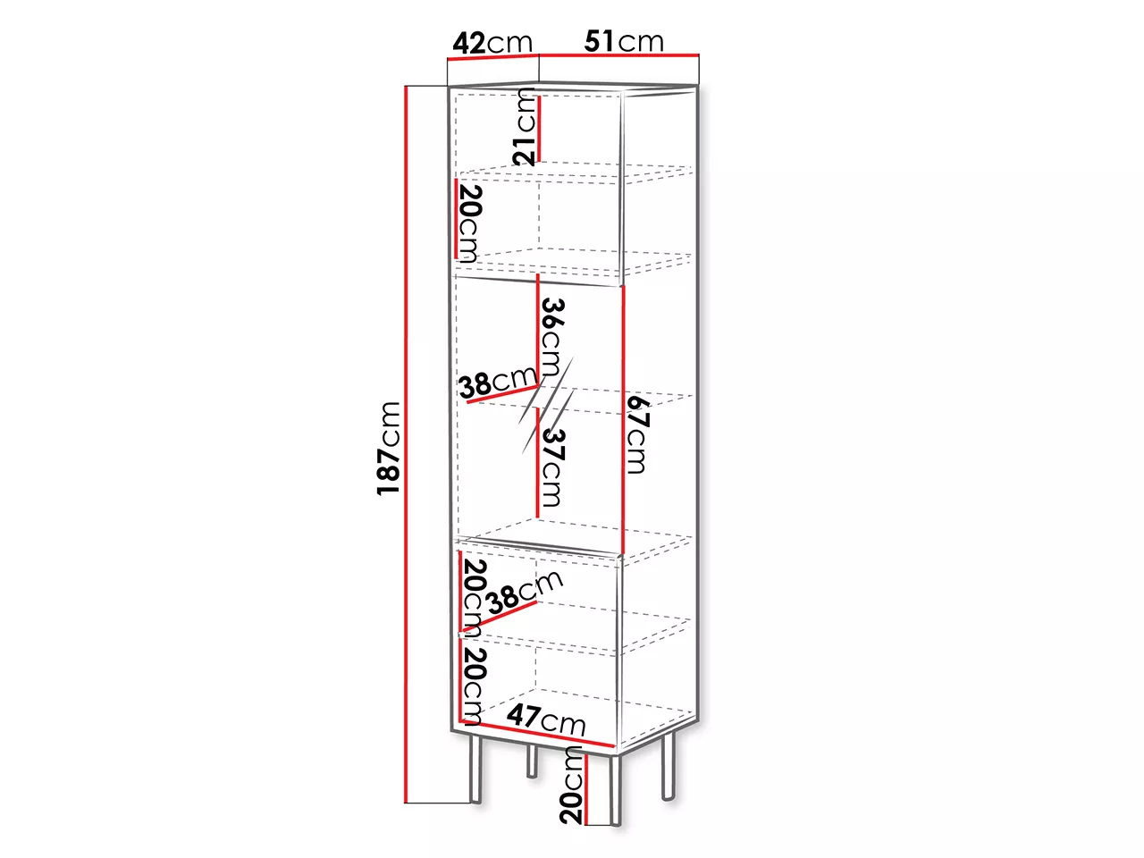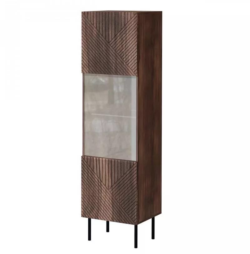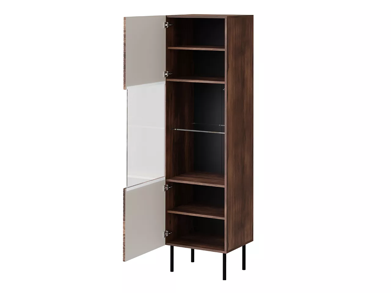 Úzká vitrína RIESEL přináší do interiéru styl a funkčnost díky svým výrazným barvám a jemnému dekoru. Kombinuje otevřené i uzavřené úložné prostory, což z ní činí ideální doplněk do jídelny. Za skleněnou částí můžete vystavit dekorativní nádobí či sklenice, zatímco skryté police poskytnou praktické místo pro bytový textil, jako jsou ubrusy a ubrousky.