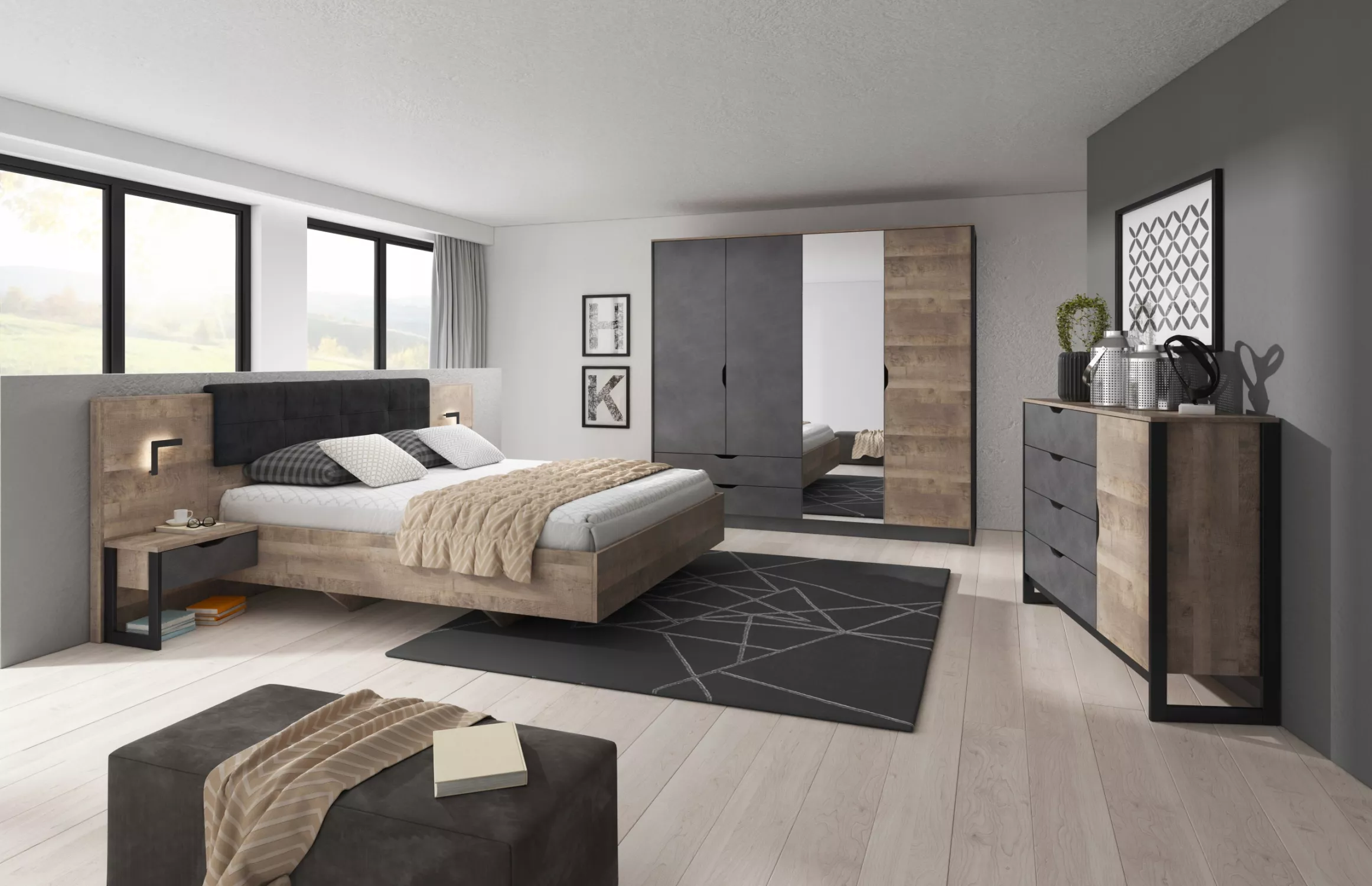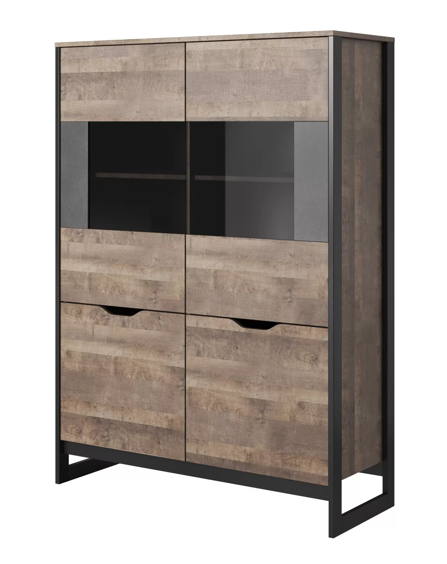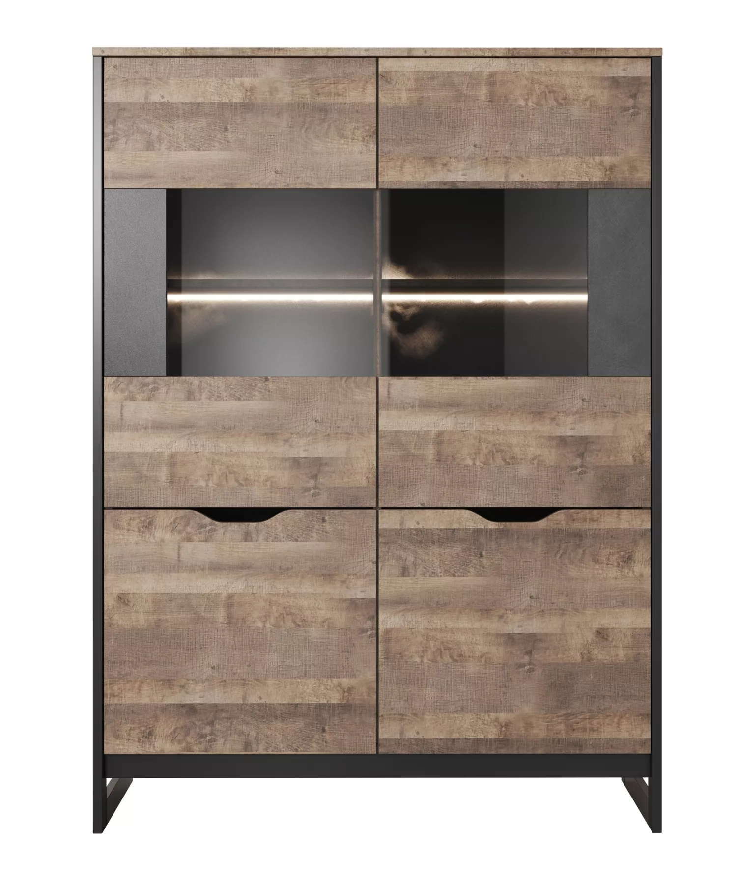 Široká vitrína GORDO zaujme originálním industriálním designem, kde se snoubí výrazný dekor dubu sand grande s prvky v barvě matera a efektem jemného opotřebení. Tónovaná dvířka z tvrzeného skla působí elegantně, a zároveň chrání obsah před prachem. LED osvětlení, které lze dokoupit, dodá vystaveným předmětům i celému interiéru jedinečnou loftovou atmosféru.