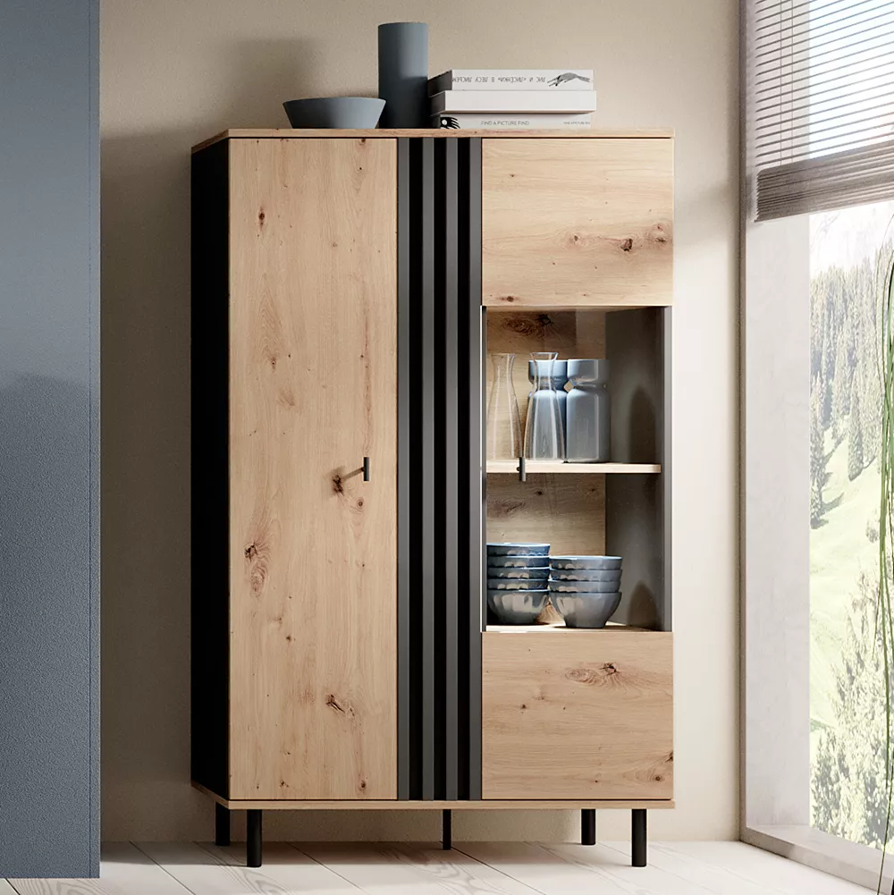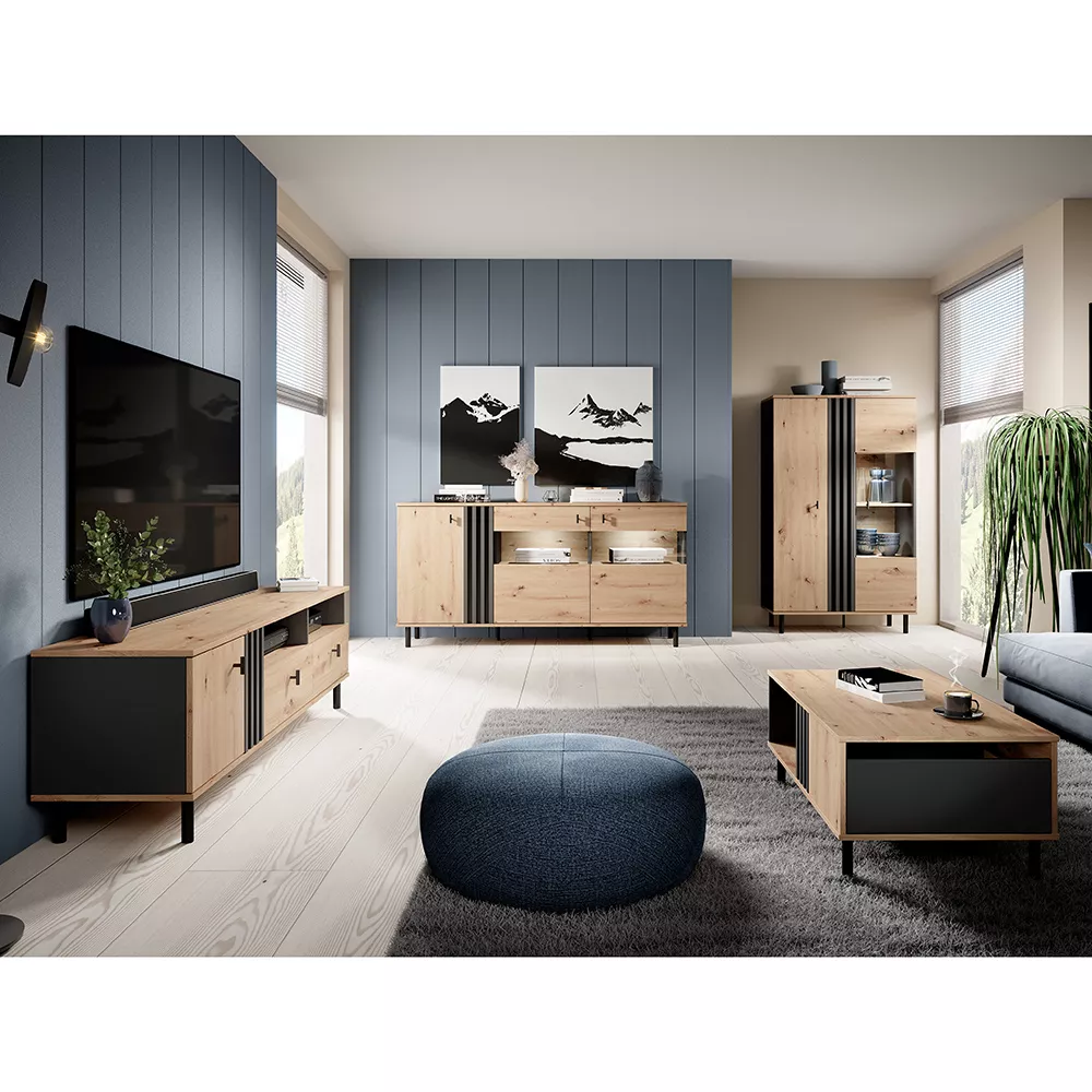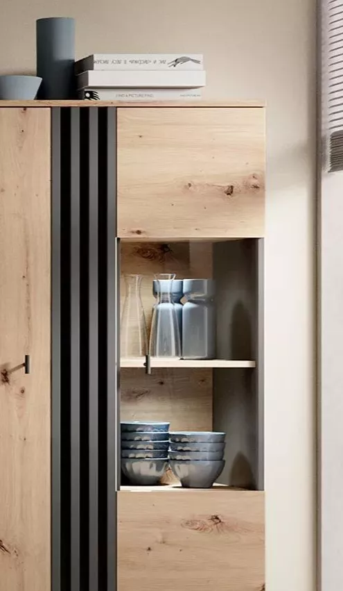 Vitrína CHATOM v oblíbené kombinaci přírodního dubu a kontrastní antracitové barvy vnáší do obýváku současný styl s přírodním nádechem. Decentní lamely podtrhují moderní design a zvýrazňují čisté linie nábytku. Na míru navržené svislé úchytky a černé kovové nožky zajišťují lehkost celého vzhledu. Vnitřní police lze doplnit LED osvětlením pro ještě výraznější efekt.