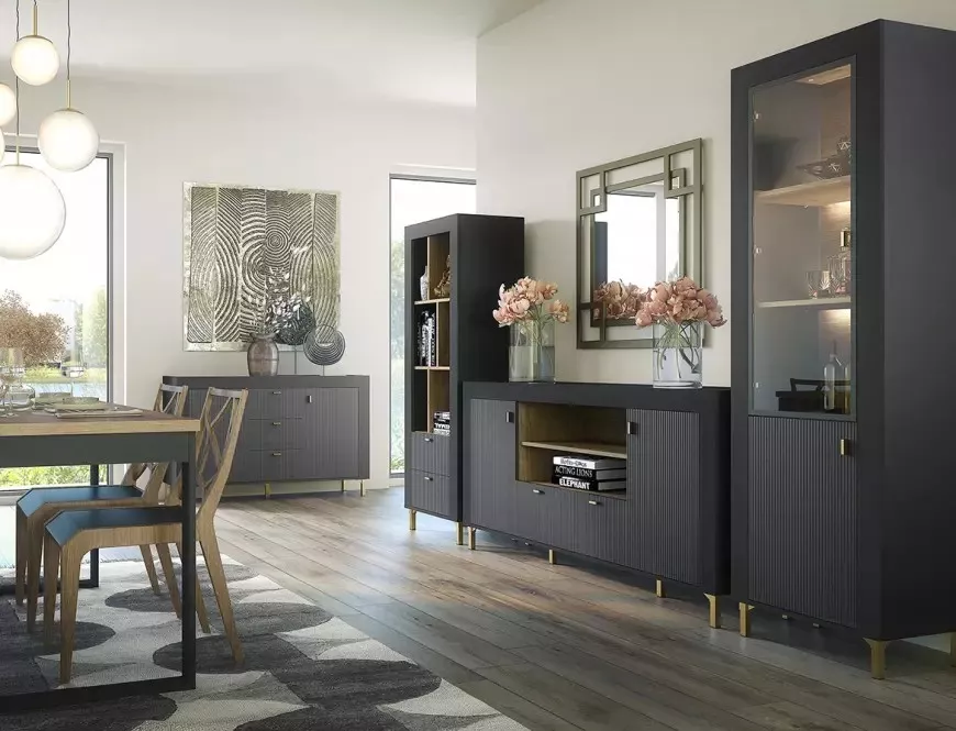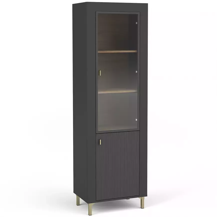 Úzká prosklená vitrína AUROVA stylově zapadne do moderních a skandinávských interiérů. Díky proskleným dvířkám můžete vystavit své oblíbené dekorace a suvenýry, zatímco ve spodní části schováte ubrusy nebo dokumenty. Drážkovaná dvířka dodávají nábytku jemný, ale výrazně elegantní vzhled.