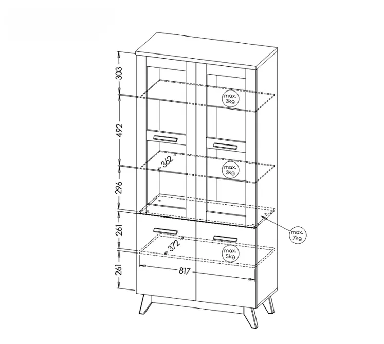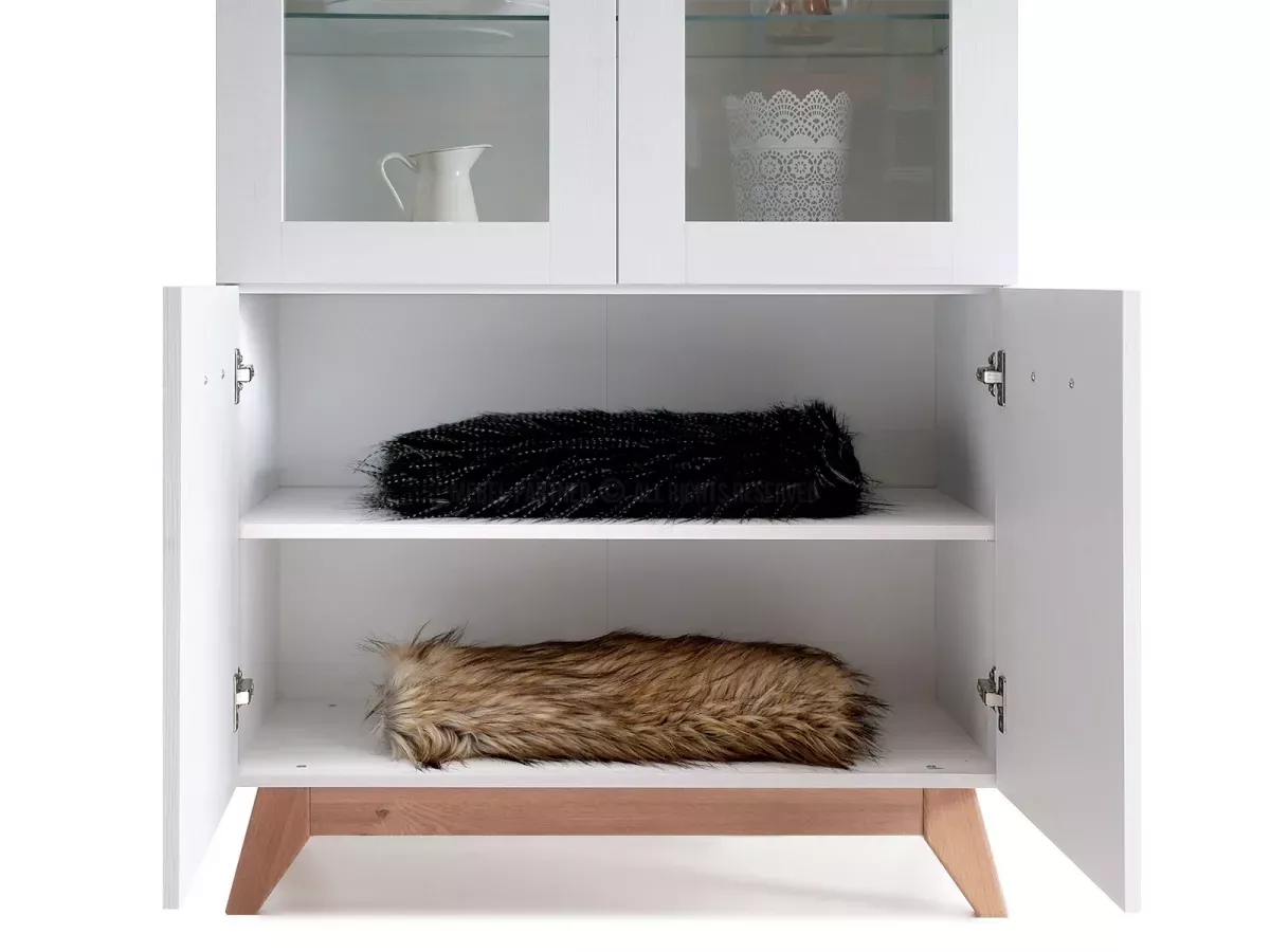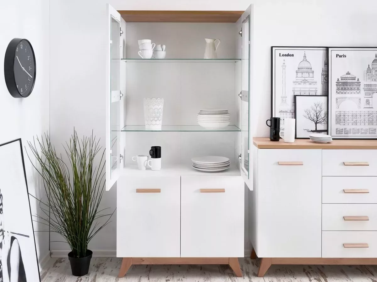 Prosklená vitrína BUTNER dokonale zapadne do každého obývacího pokoje ve skandinávském stylu. Díky proskleným dvířkám snadno vystavíte fotografie nebo dekorace. Stabilitu vitríně poskytují masivní vysoké nožky.