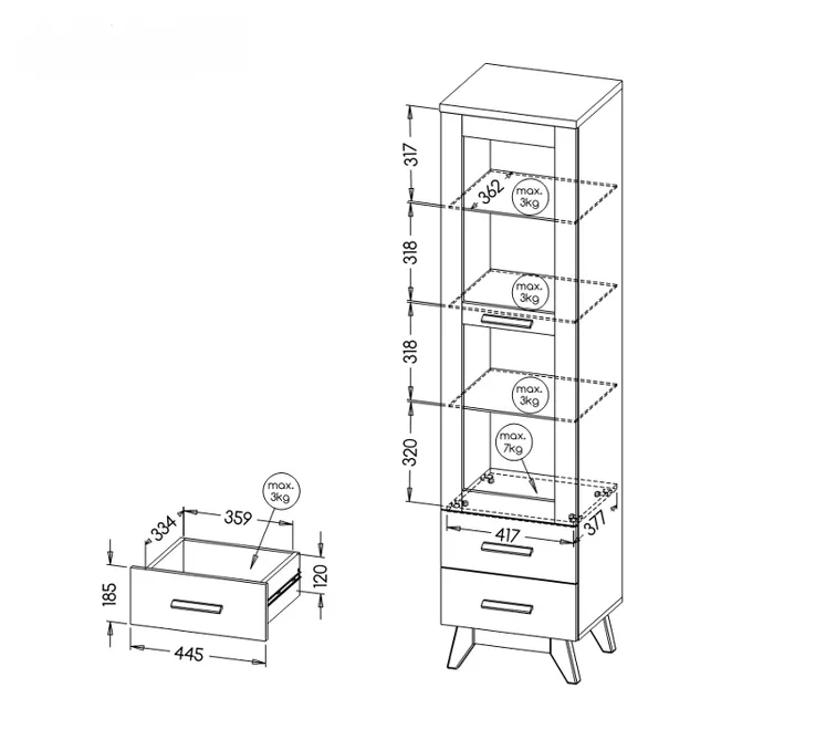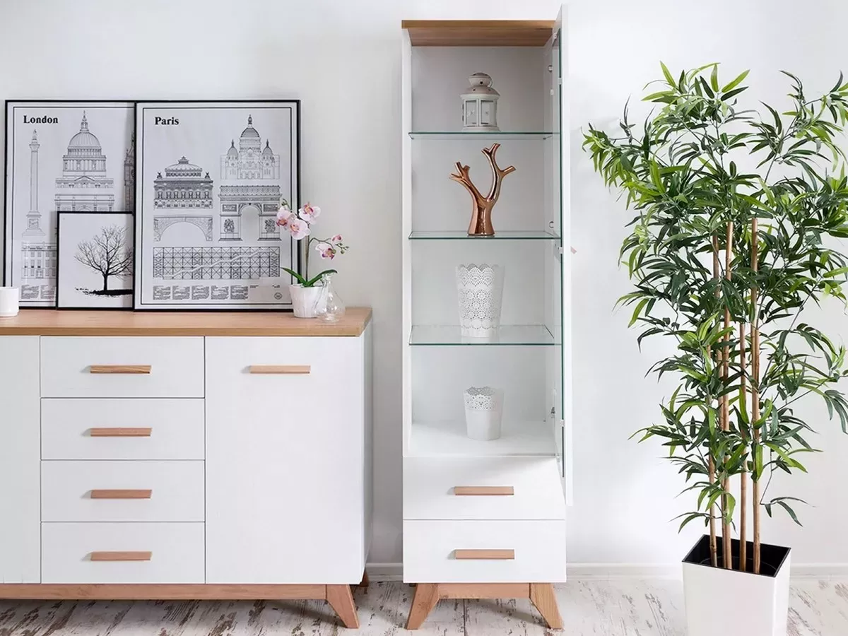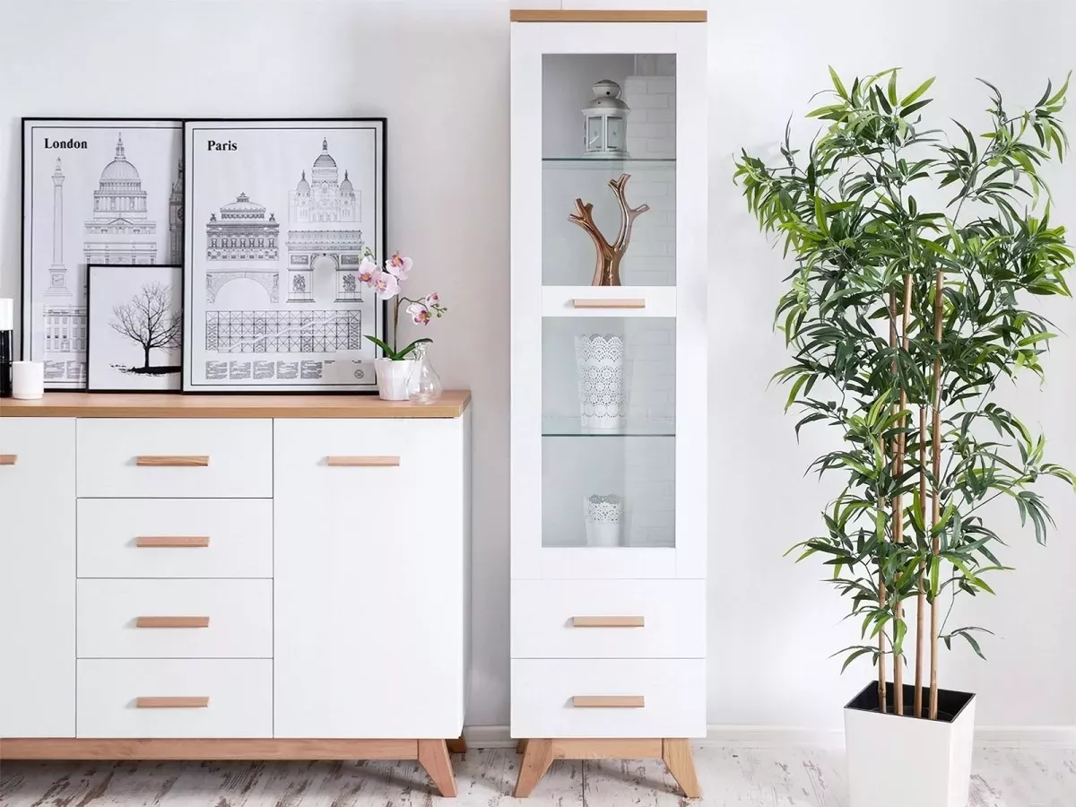 Úzká prosklená vitrína BUTNER dokonale zapadne do každého obývacího pokoje ve skandinávském stylu. Díky proskleným dvířkám snadno vystavíte fotografie nebo dekorace. Disponuje také 2 šuplíky. Stabilitu vitríně poskytují masivní vysoké nožky.