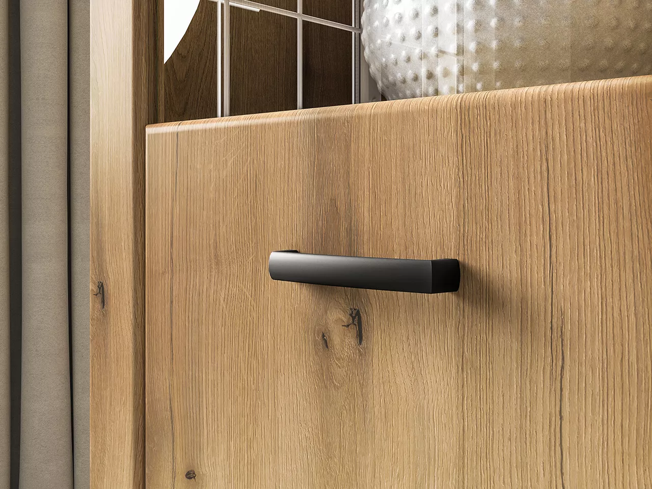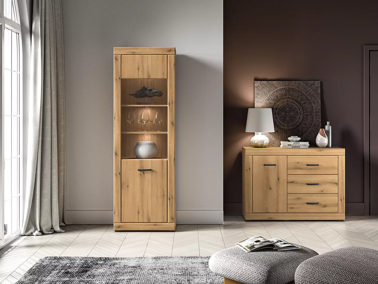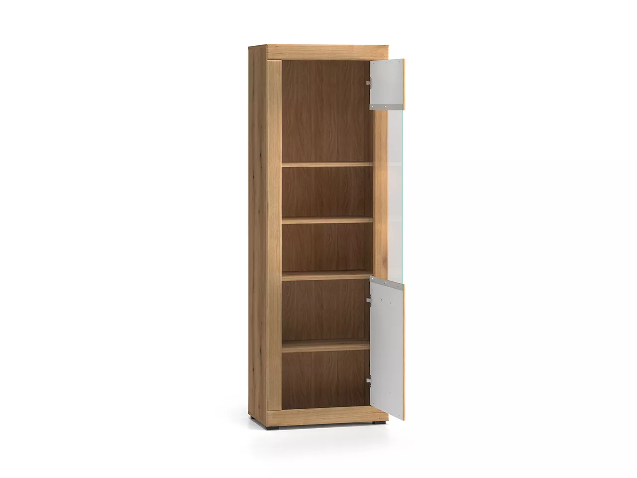Prosklená vitrína ADELLA díky svému dekoru dubu skvěle zapadne do každého stylu interiéru. Prosklená dvířka umožní vystavení vašich oblíbených dekorací nebo nádobí. Systém tichého dovírání zpříjemní každodenní používání.