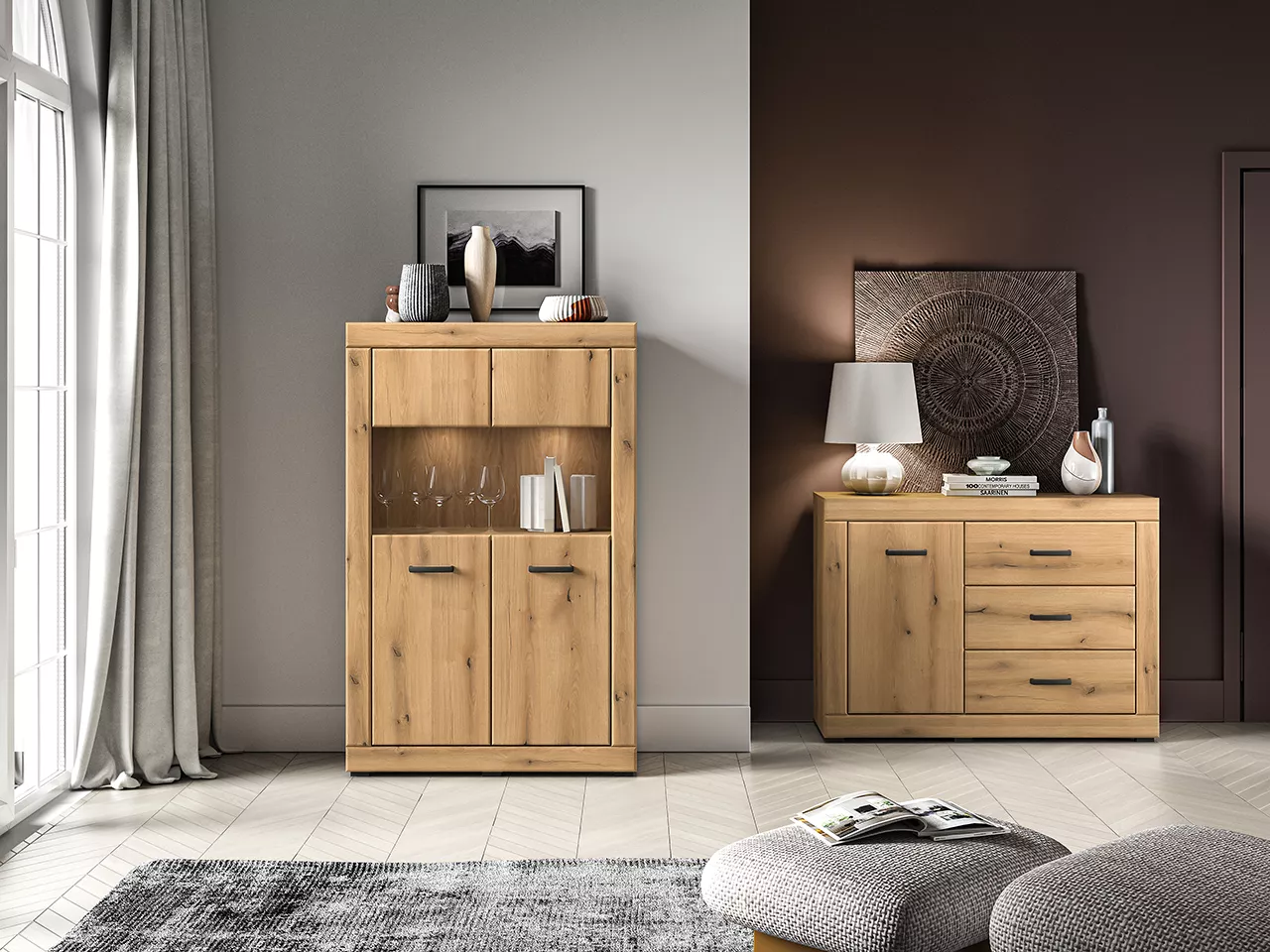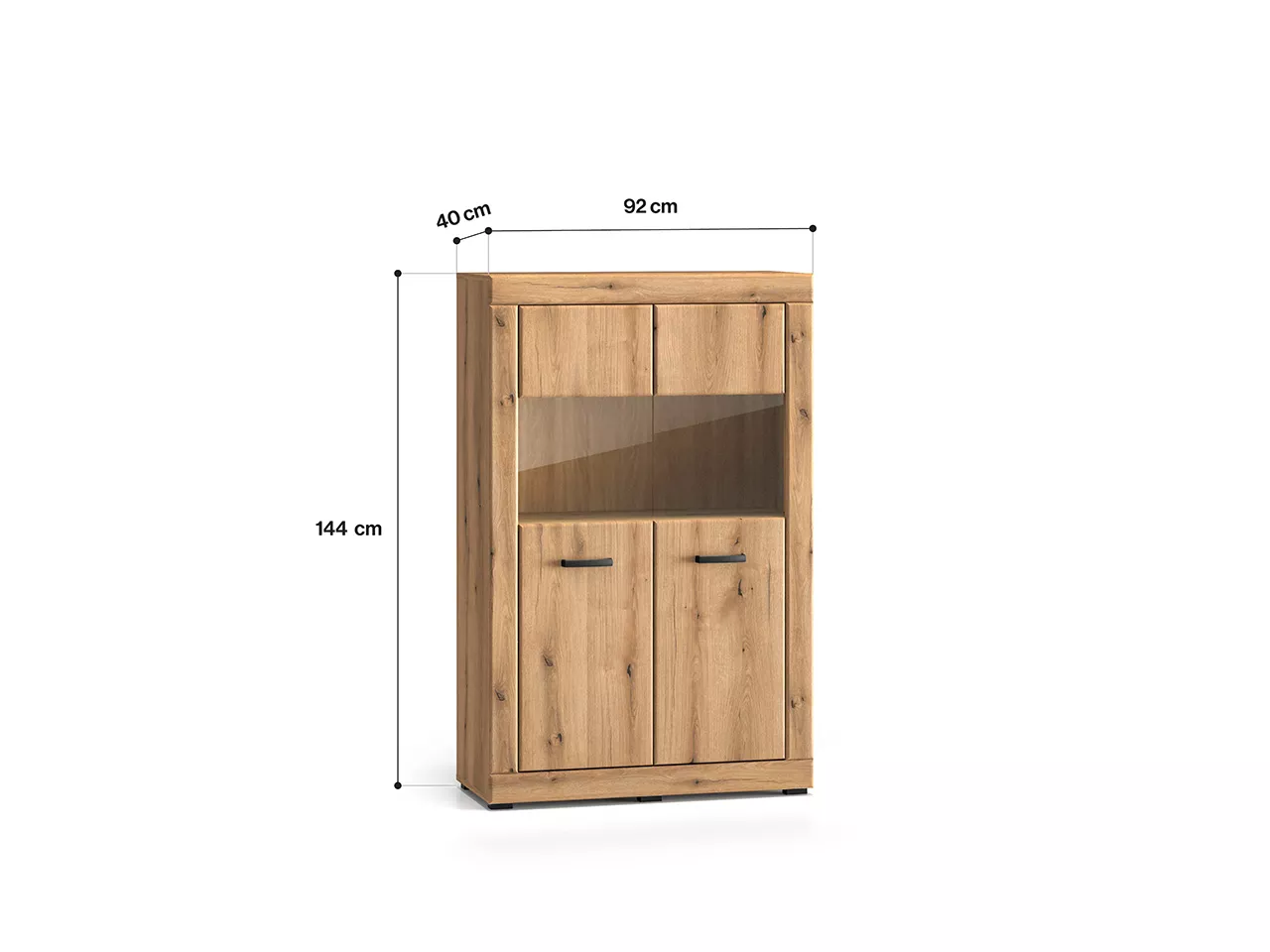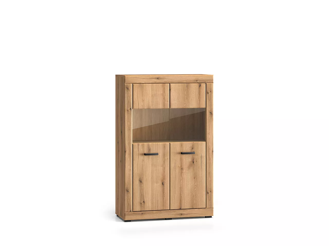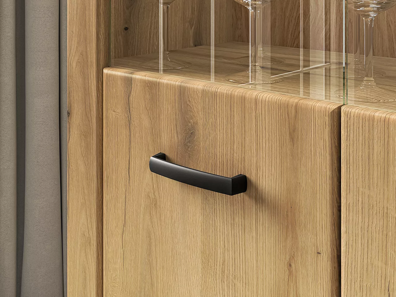 Nízká prosklená vitrína ADELLA díky svému dekoru dubu skvěle zapadne do každého stylu interiéru. Prosklená dvířka umožní vystavení vašich oblíbených dekorací nebo nádobí. Systém tichého dovírání zpříjemní každodenní používání.