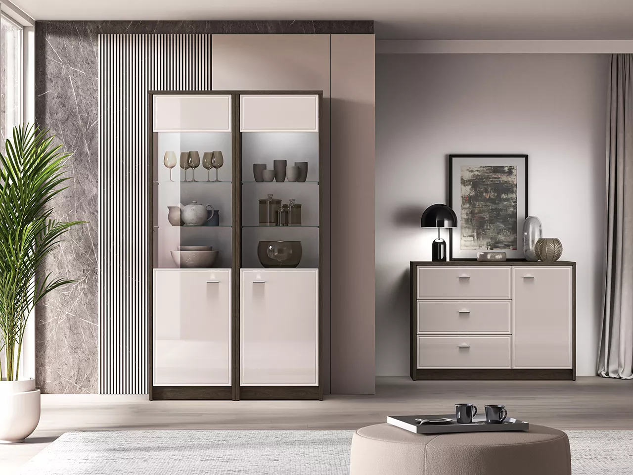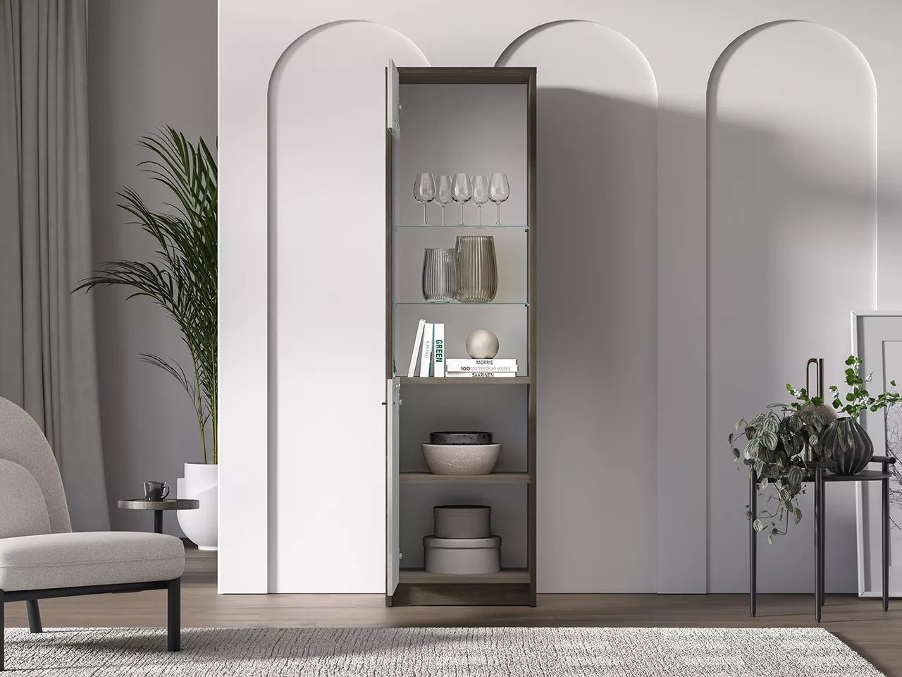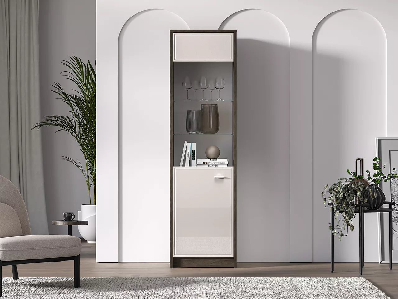 Prosklená vitrína SAFIEH je stylovým i praktickým kouskem nábytku do každého obývacího pokoje. Disponuje 4 prostornými policemi pro vystavení vašich oblíbených dekorací nebo nádobí. Systém tichého dovírání zpříjemní každodenní používání.