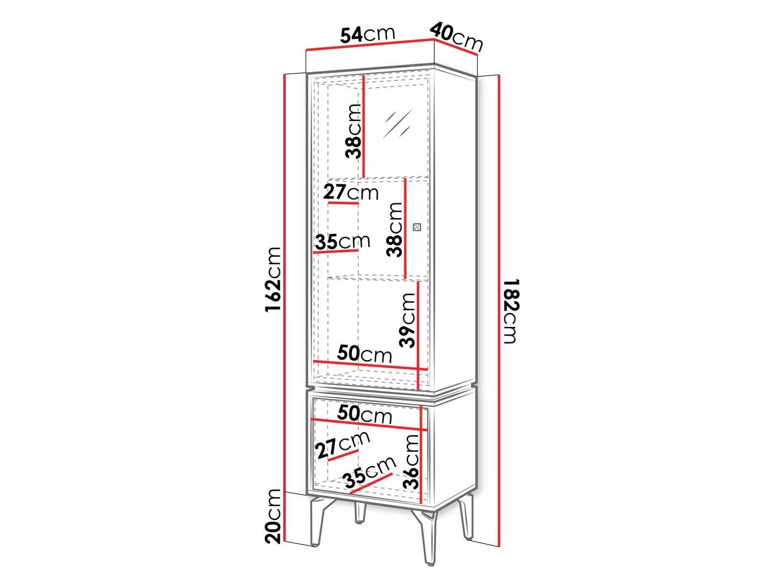 Pořiďte si vysokou prosklenou skříňku KALWI, která zaujme jedinečným designem a praktickým uspořádáním. 3D struktura spodních dvířek přidává nábytku originální charakter. Tmavé sklo horních dvířek elegantně zvýrazní vystavené předměty.