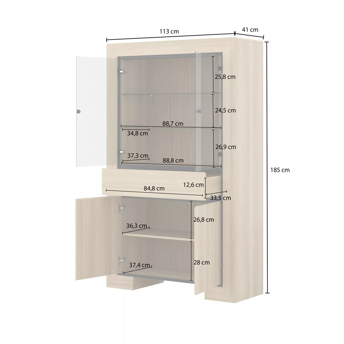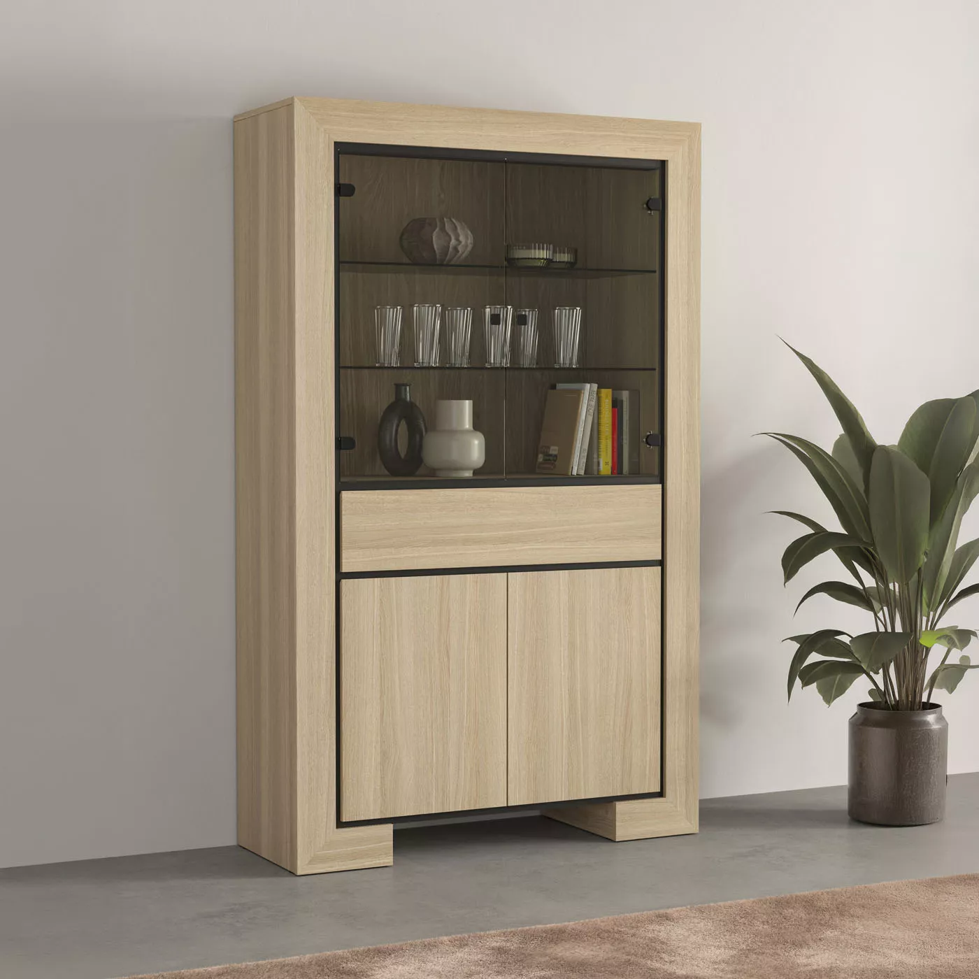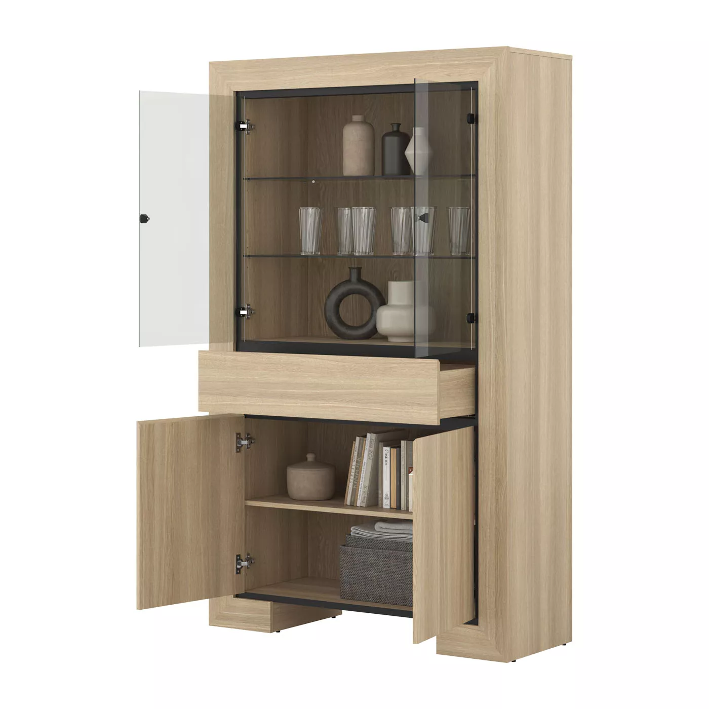 Prosklená vitrína DASI svým dekorem dubu a množstvím úložného prostoru spojuje eleganci a funkčnost. Prostorné police a šuplík vám umožní uschovat všechny potřebné dokumenty, knihy nebo dekorace. Vitrína je vybavená systémem tichého dovírání, což zpříjemní její každodenní používání.