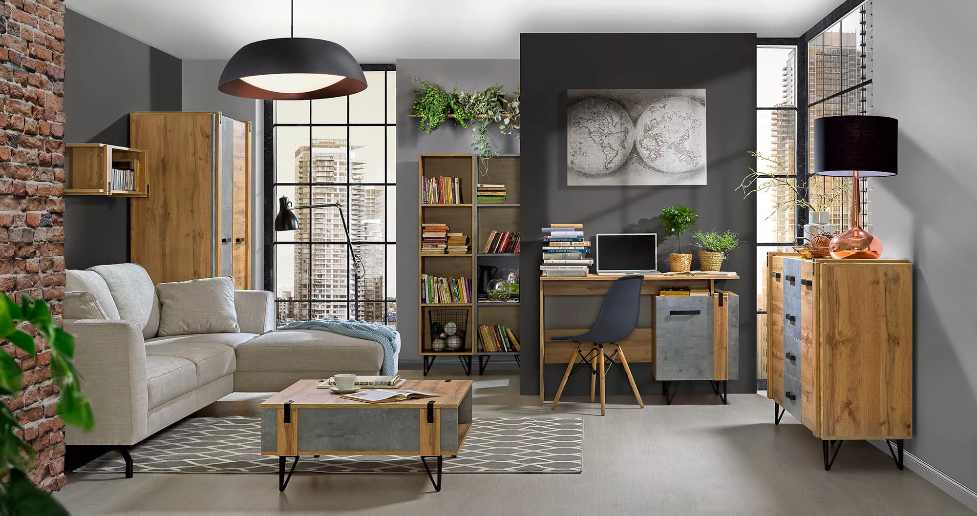Psací stůl CONOVER - dub wotan / beton / černý
