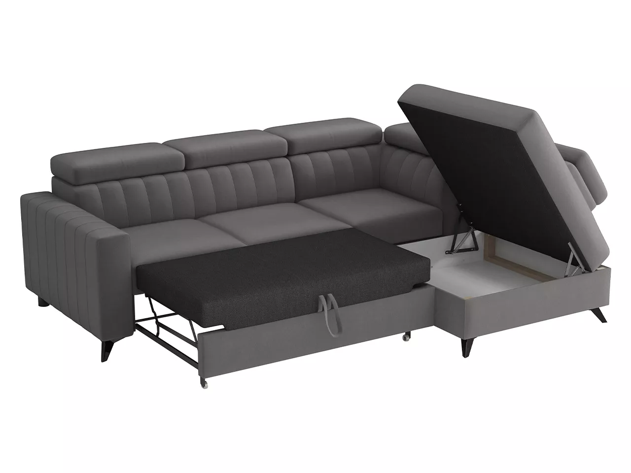 Moderní rohová sedačka KINU je ideálním místem pro relaxaci. Díky funkci rozkládání nabízí spací lůžko o rozměrech 133x198 cm, které je vhodné i pro každodenní spaní. Polohovatelné opěrky hlavy zajišťují lepší podporu krční páteře a snižují napětí svalů, což přináší maximální pohodlí. Nechybí ani praktický úložný prostor, který pomáhá udržet pořádek v místnosti.