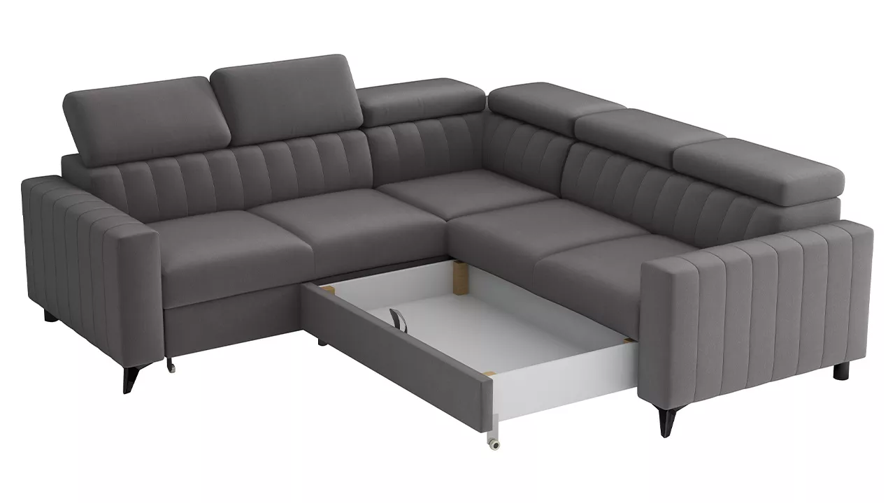 Sedací souprava s úložným prostorem KINU spojuje styl a mimořádné pohodlí v jednom. Nadchne vás moderním designem a měkkým čalouněním, které přímo vybízí k relaxaci. Díky funkci rozkládání na lůžko o rozměrech 160 x 206 cm je ideální pro každodenní spaní – praktické řešení nejen do menších bytů, ale i pro hosty. Polohovatelné opěrky hlavy pomáhají snížit únavu krku a zad, takže si můžete užít skutečně hluboký odpočinek.