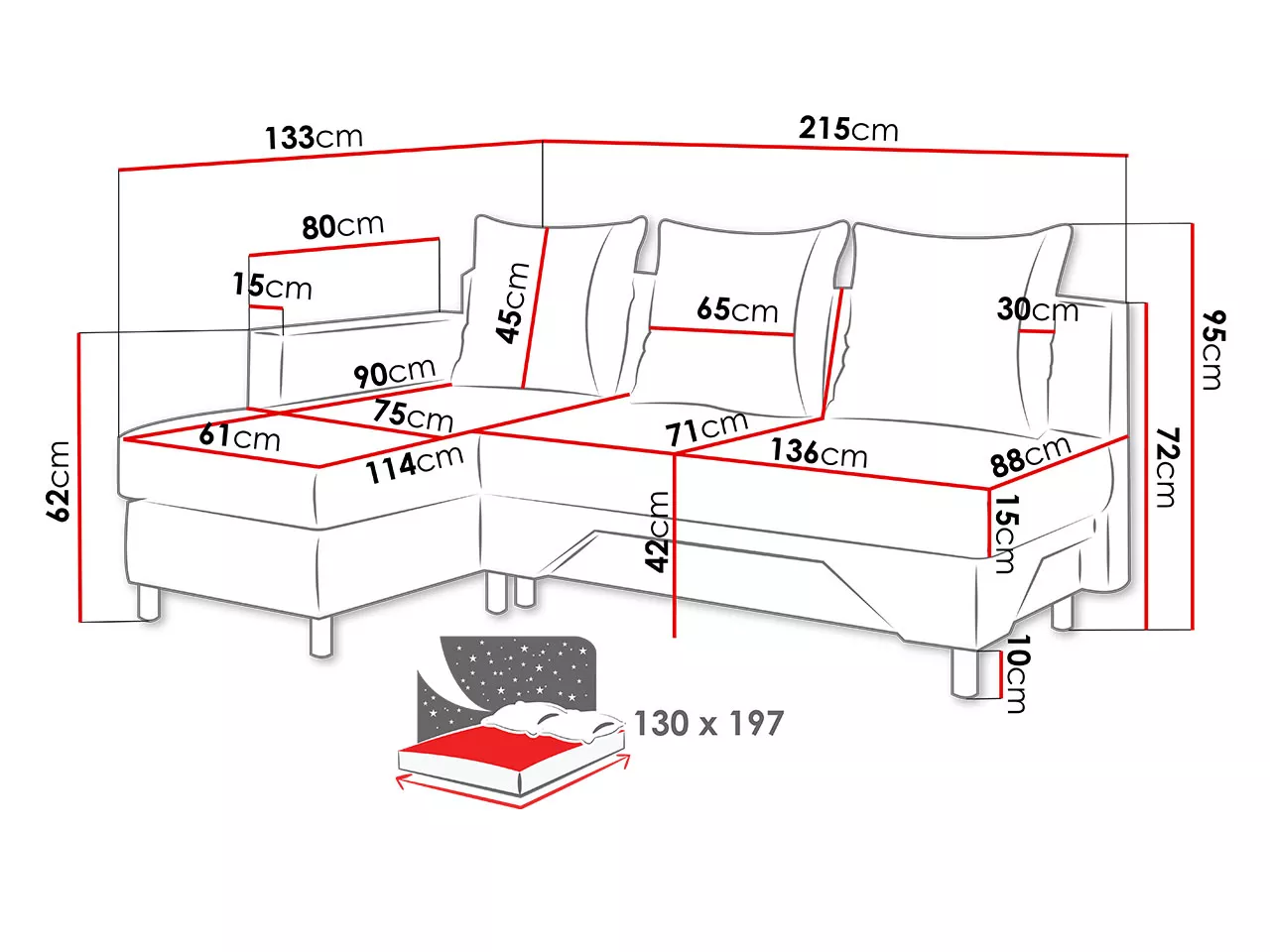 Rohová rozkládací sedačka MONITOS se vyznačuje stylovým designem. Jednoduchým rozložením získáte spací plochu o rozměrech 130x197 cm. V sedací soupravě naleznete praktický úložný prostor na ložní prádlo.