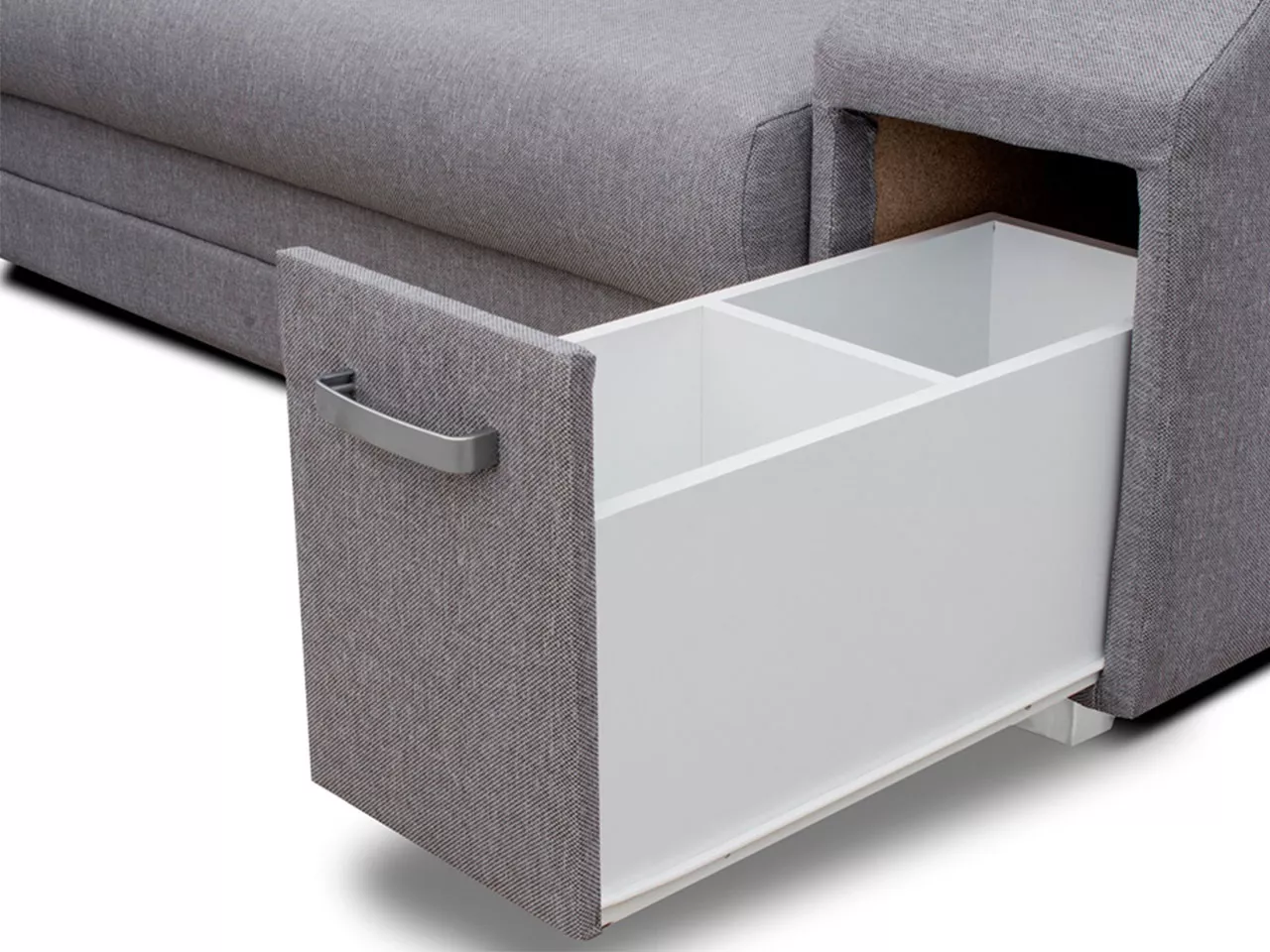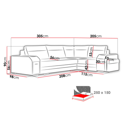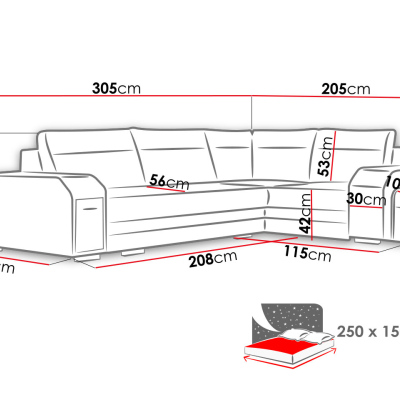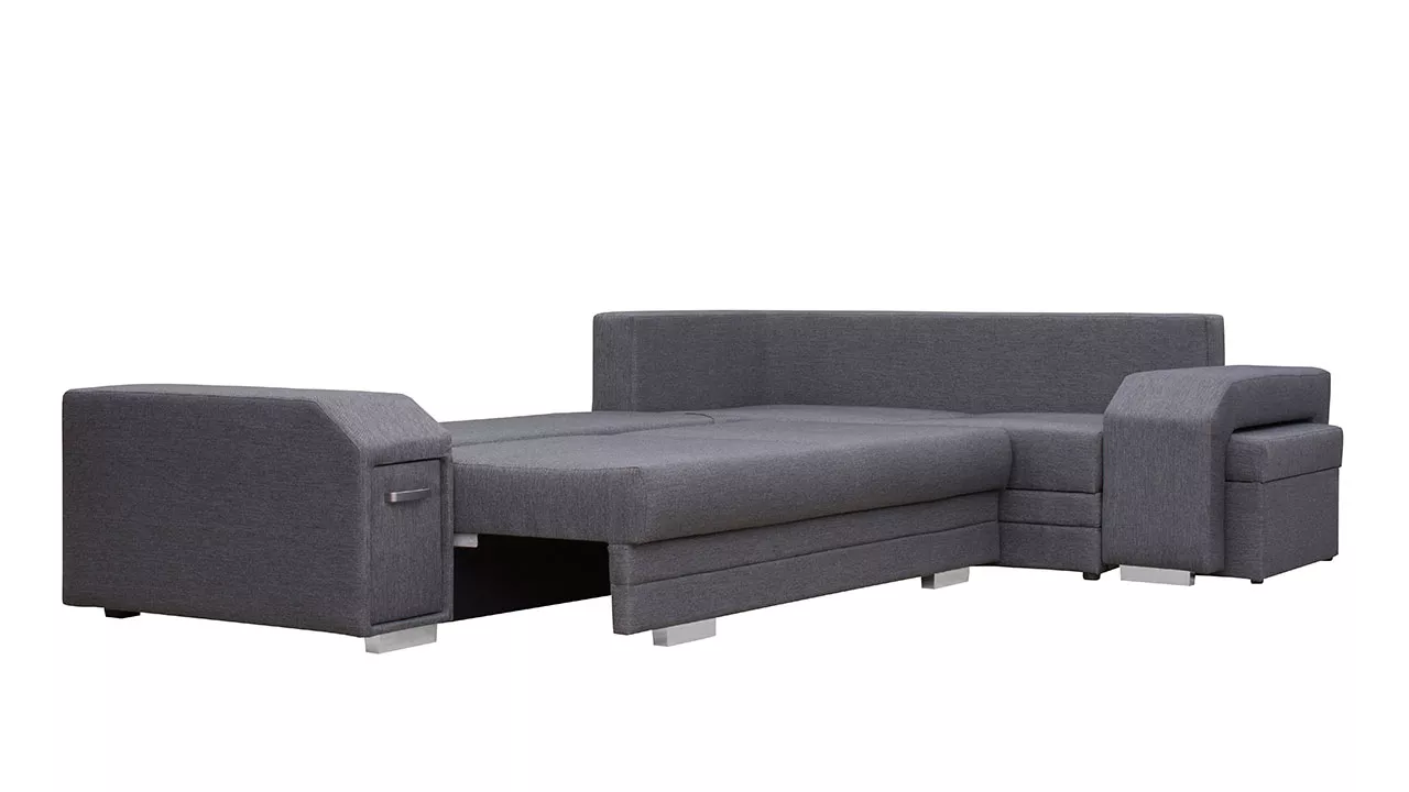 Rohová rozkládací sedačka s úložným prostorem PLANETAS se vyznačuje stylovým designem. Rozkládací sedačka, která je k dispozici v nejmódnější barevné kombinaci, zkrášlí interiér vyzdobený v moderním stylu. Dá vám prostor na pohodlný odpočinek po náročném dni a umožní vám trávit volný čas s přáteli a rodinou. Jednoduchým rozložením získáte spací plochu o rozměrech 150x250 cm. V sedací soupravě naleznete dva praktické úložné prostory na ložní prádlo, které lze například také využít jako místo pro úschovu sezónního oblečení. Zadní část sedačky je čalouněná látkou, což umožňuje její umístění kdekoli v místnosti. V sedačce navíc naleznete zabudovaný vysouvací bar na boční straně.