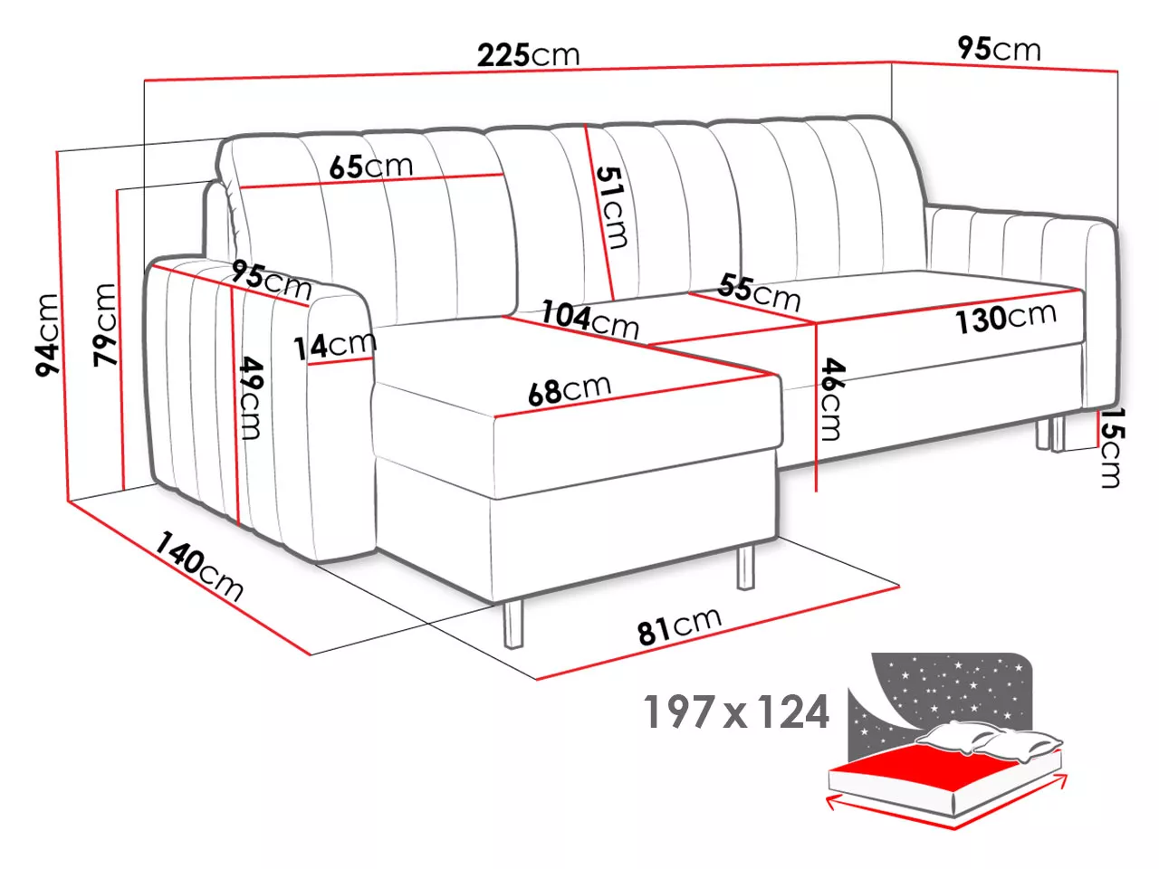 Rohová sedačka REIKA nabízí funkci každodenního spaní o lůžku 124x197 cm a 2 praktické úložné prostory. Zádovou opěrku tvoří volně ložené měkké polštáře se snímatelným potahem na zip. Zadní část sedačky je čalouněná látkou, což umožňuje její umístění kdekoli v místnosti.