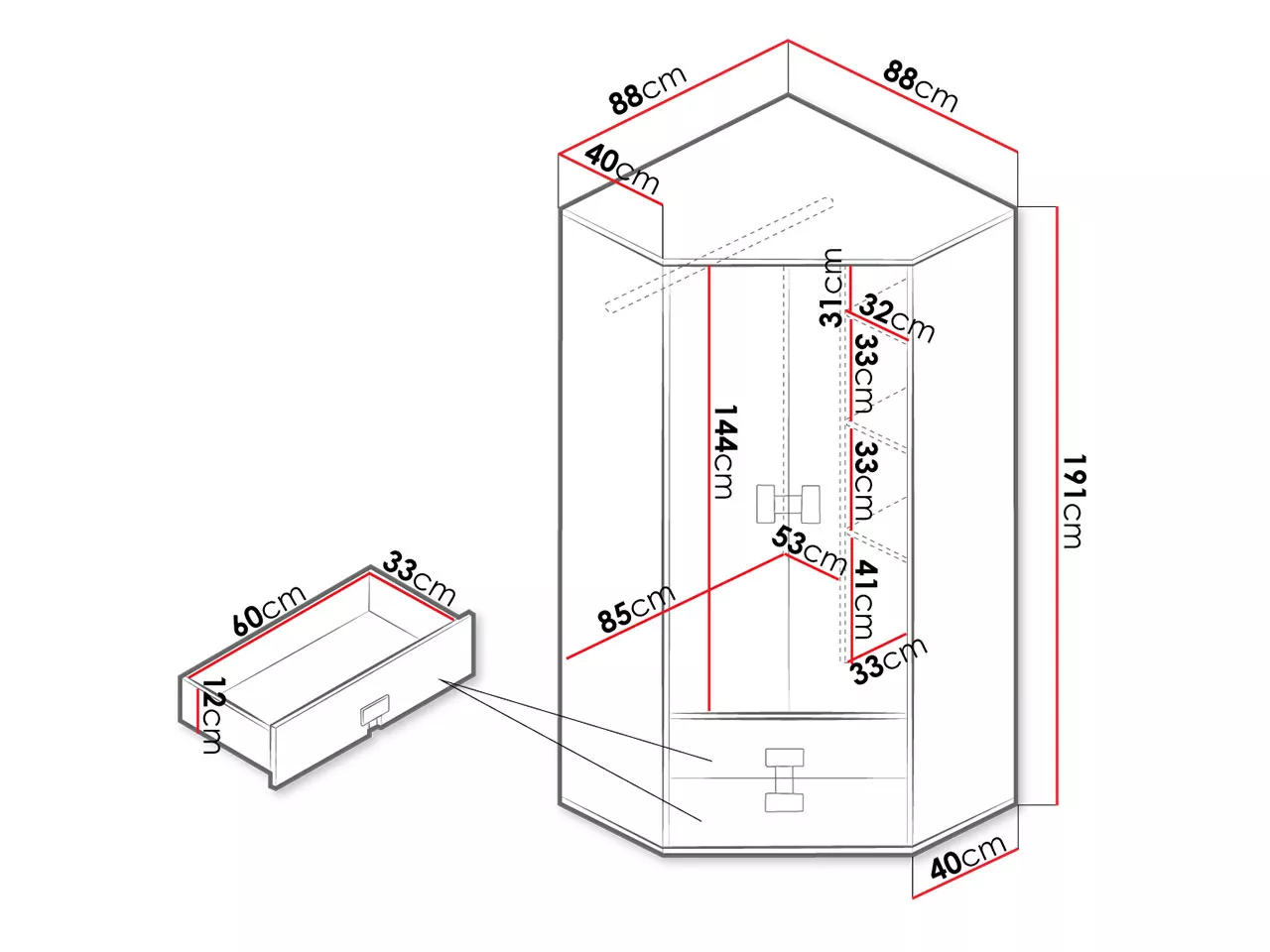 Rohová šatní skříň BASHIRA se vyznačuje moderním designem a funkčním řešením i do menších prostor. Vnitřní uspořádání nabízí úložný prostor v podobě několik hlubokých polic a šatní tyče. Spodní část tvoří zásuvky, které umožňují plné vysunutí.