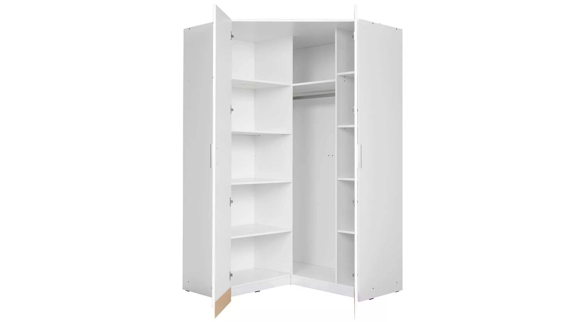 Rohová šatní skříň 117 cm FUNZA 5 - alpská bílá / lesklá bílá