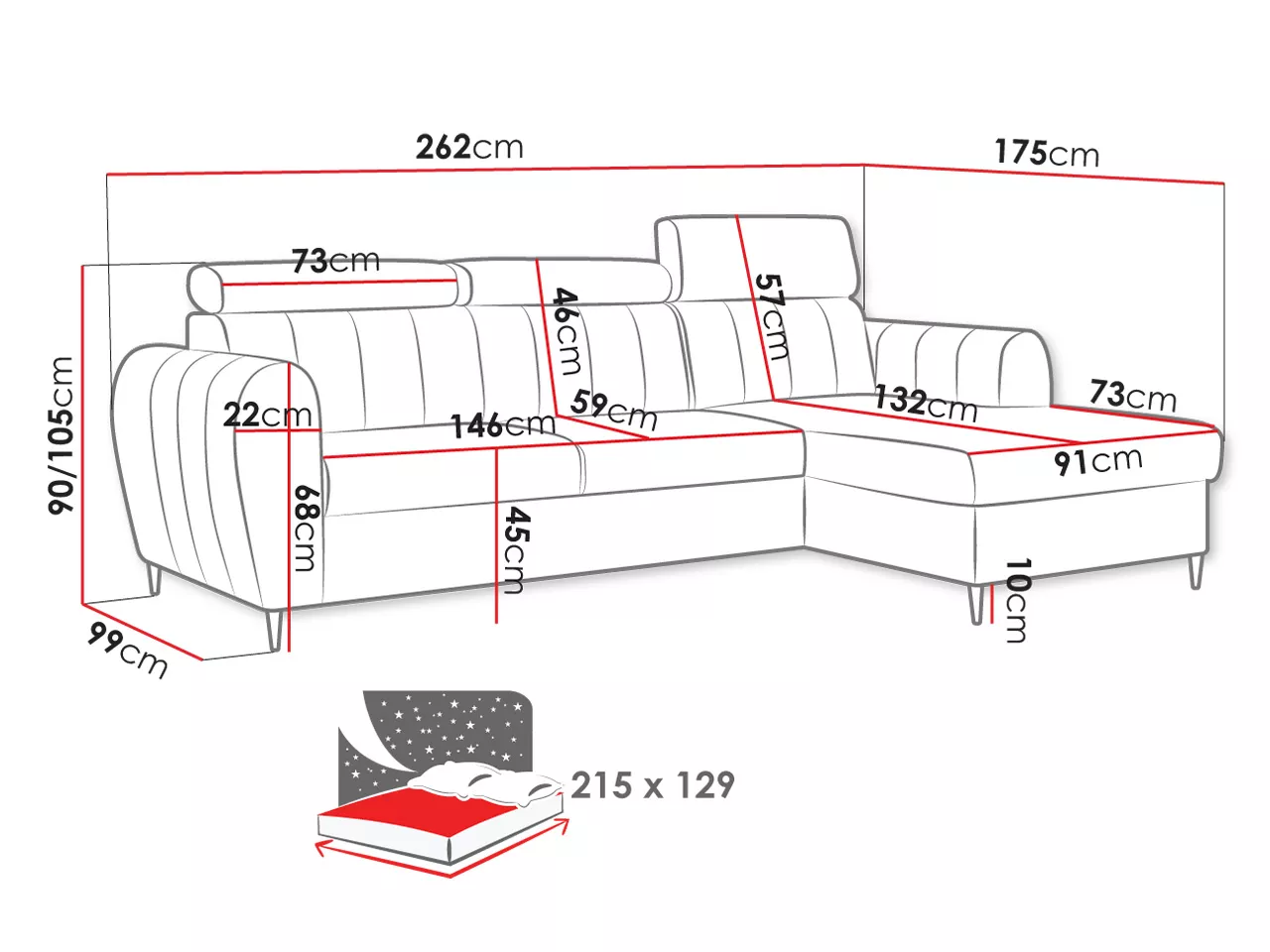 - ložná plocha: 129x215 cm
