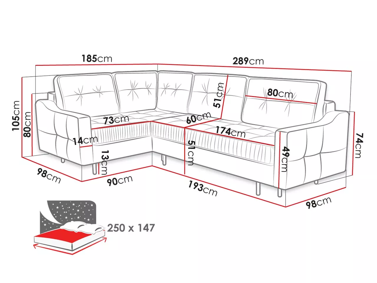 Rohová sedačka LAREDO je skvělou volbou do obývacího pokoje zařízeném v klasickém, moderním a glamour stylu. Jemné prošívání a nařasené detaily dodávají sedačce jedinečný vzhled. Praktické úložné prostory a možnost každodenního spaní na lůžku o rozměrech 147x250 cm činí ze sedačky ideální volbu pro pohodlné bydlení s multifunkčním využitím.