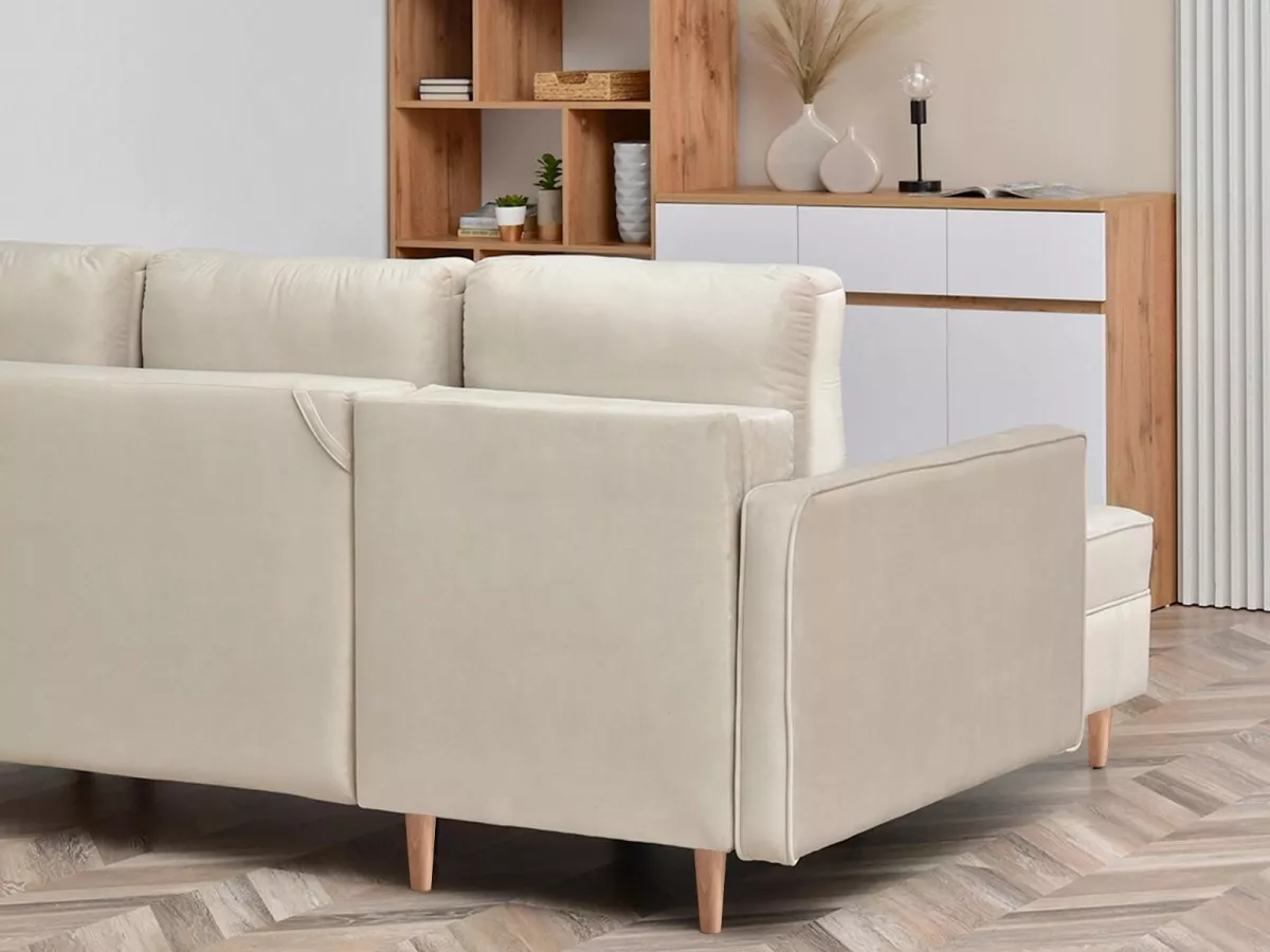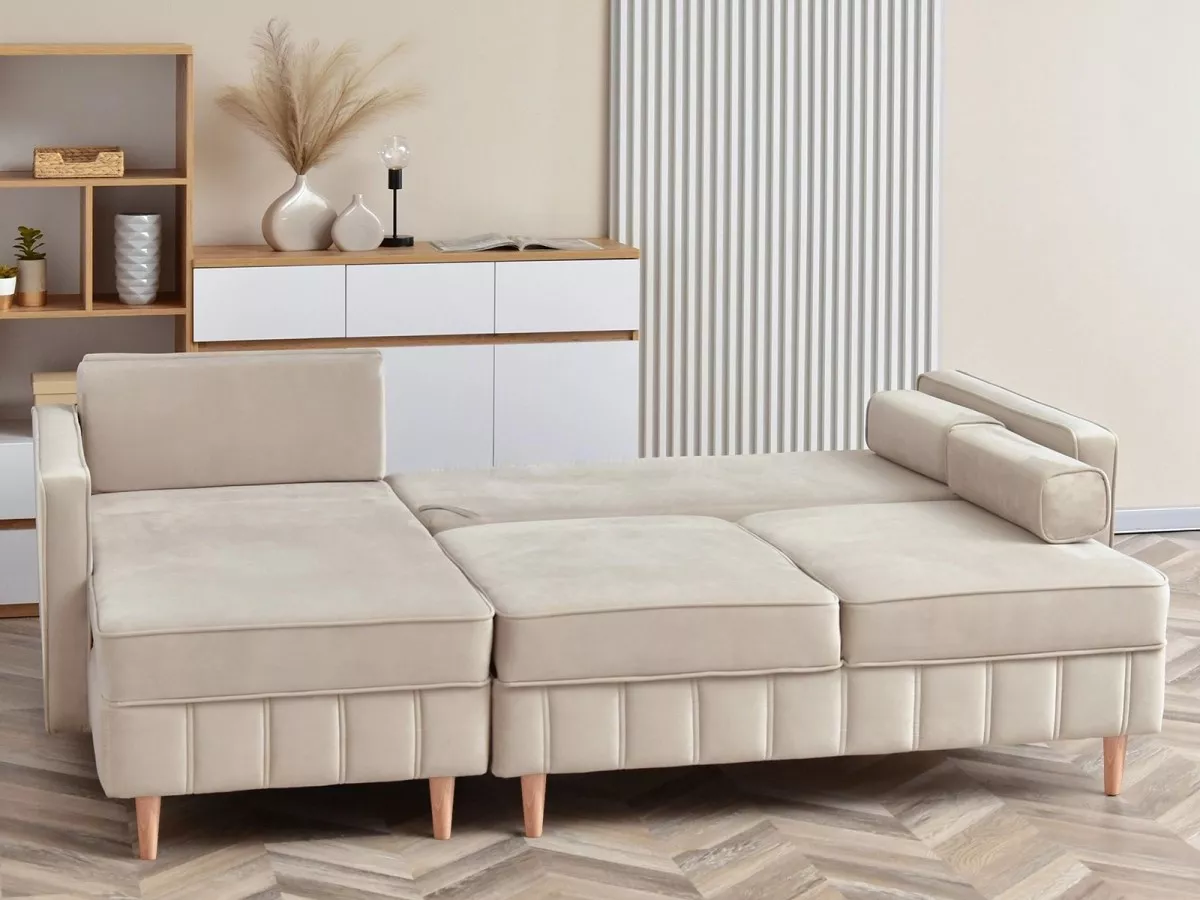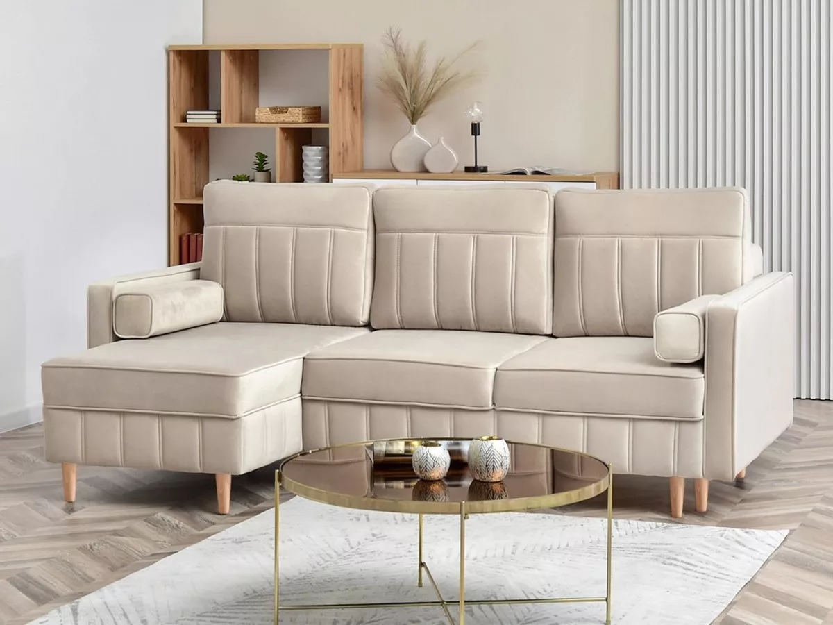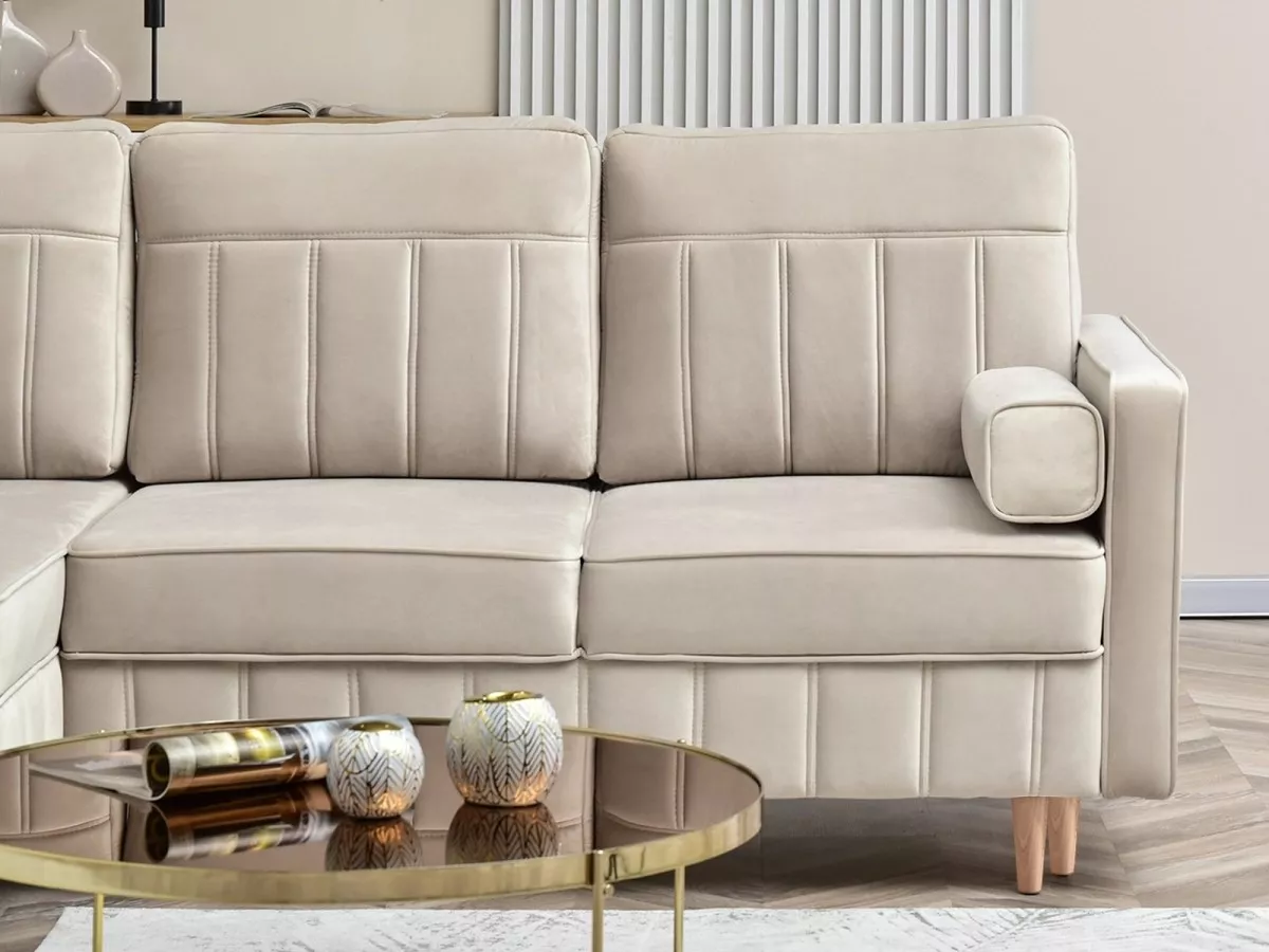 Rohová sedací souprava KARELY je zkonstruována do písmene L a nabízí funkci každodenního spaní o lůžku 150x205 cm. Zajímavý dekor výrazného prošívání na spodní části sedací soupravy a opěrných polštářích dodává eleganci a luxus.