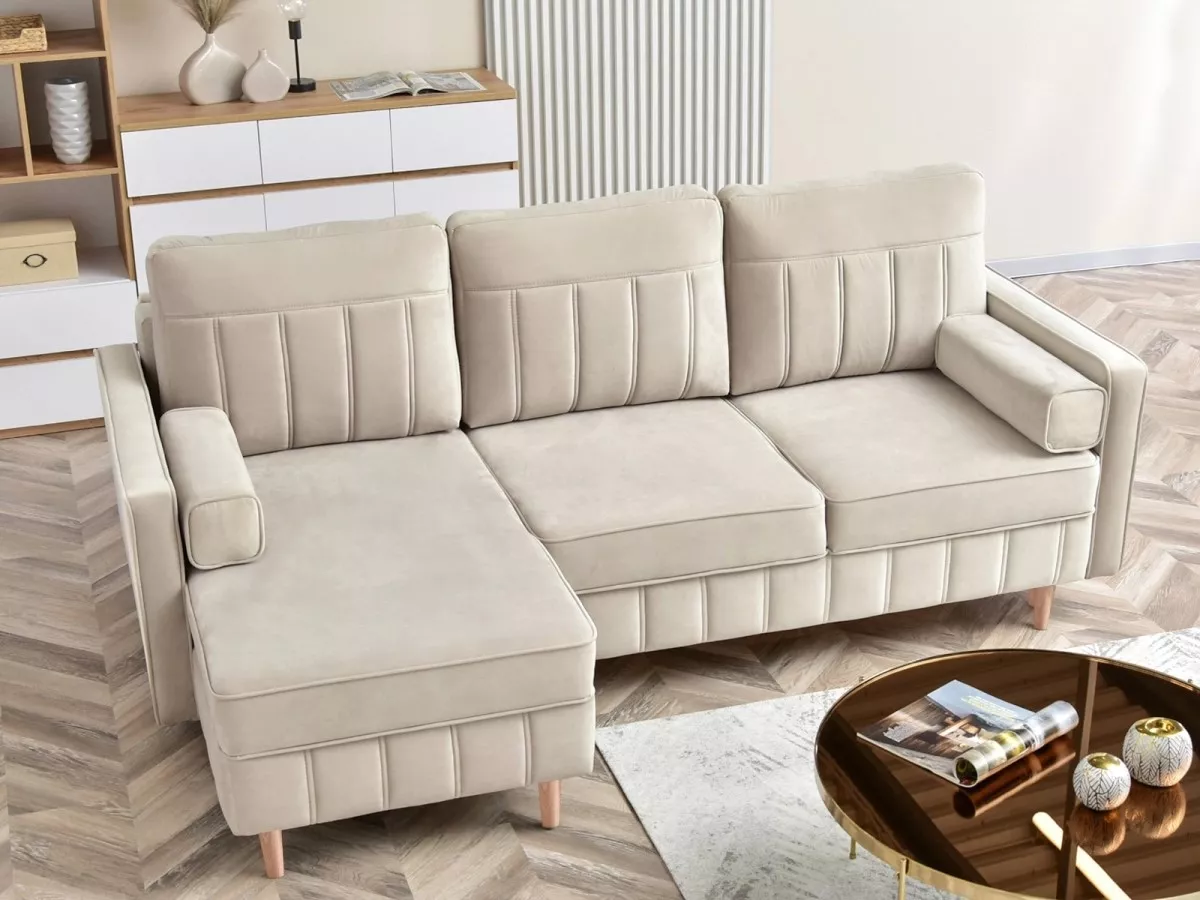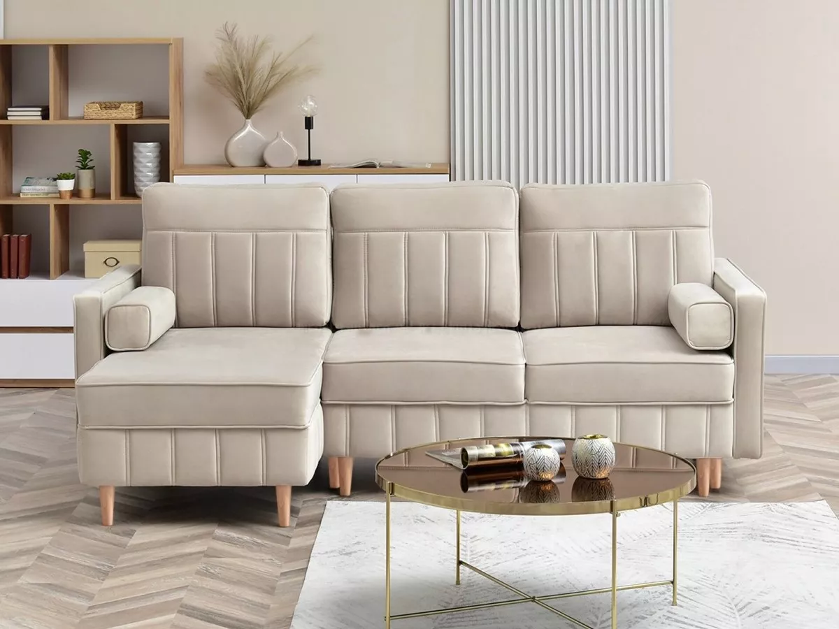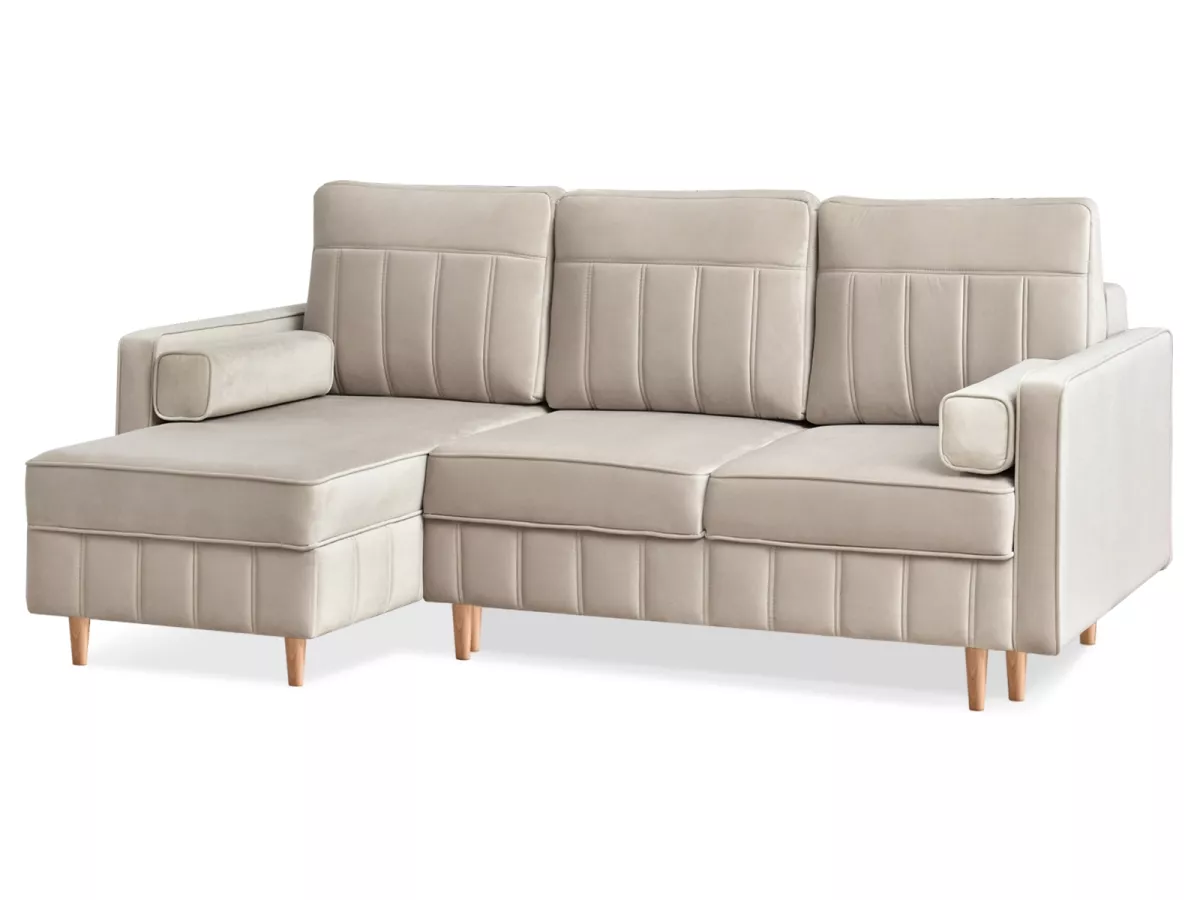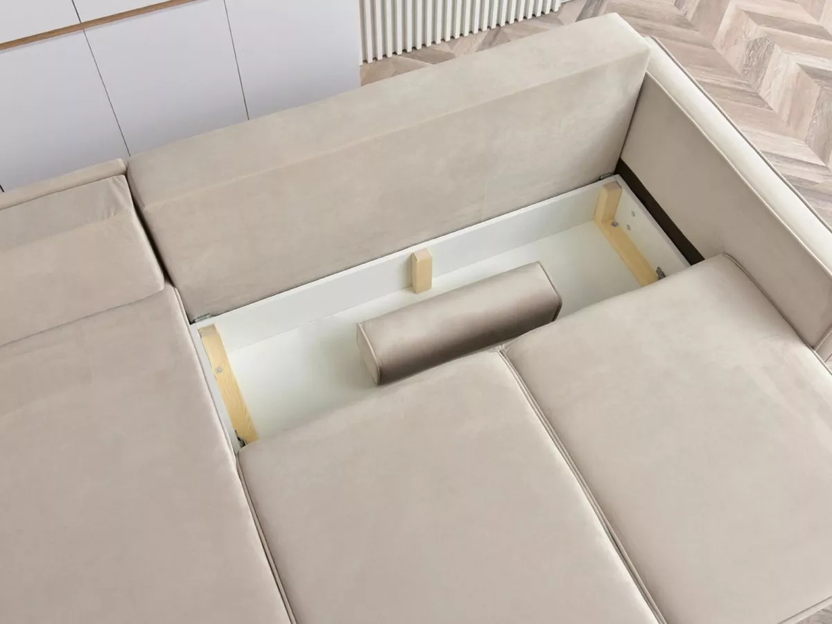 Rohová sedací souprava KARELY je zkonstruována do písmene L a nabízí funkci každodenního spaní o lůžku 150x205 cm. Zajímavý dekor výrazného prošívání na spodní části sedací soupravy a opěrných polštářích dodává eleganci a luxus.
