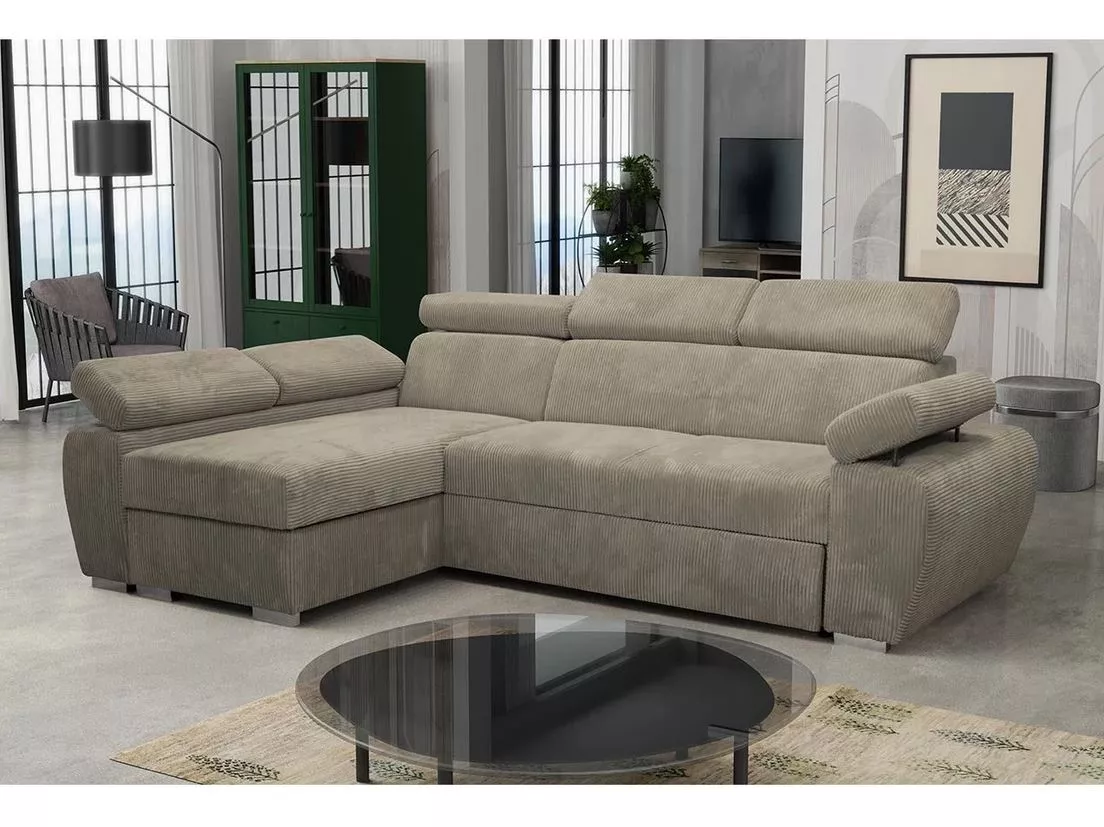Moderní rohová sedačka spojuje stylový design s maximální funkčností. Nabízí praktický úložný prostor pro uschování dek, polštářů či dalších věcí a polohovatelné opěrky hlavy, které zajistí pohodlí na míru. Díky funkci rozkládání na lůžko o rozměrech 130x200 cm je ideální pro každodenní spaní.