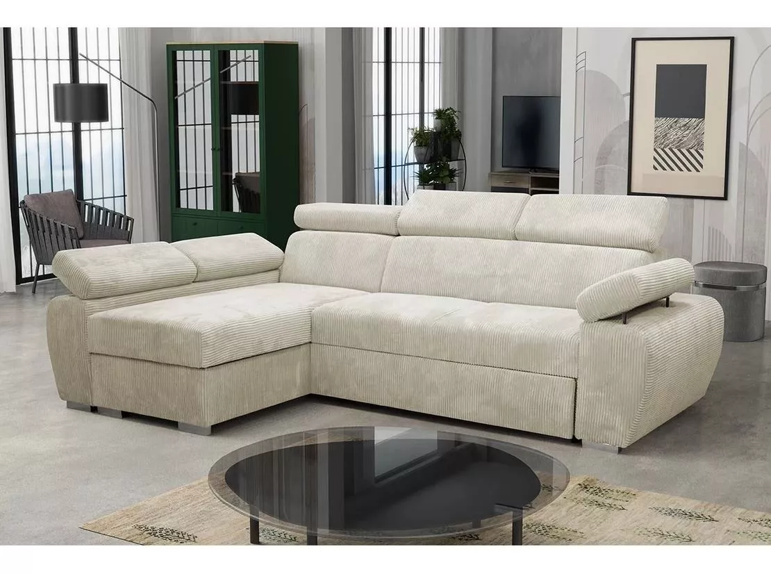 Moderní rohová sedačka spojuje stylový design s maximální funkčností. Nabízí praktický úložný prostor pro uschování dek, polštářů či dalších věcí a polohovatelné opěrky hlavy, které zajistí pohodlí na míru. Díky funkci rozkládání na lůžko o rozměrech 130x200 cm je ideální pro každodenní spaní.