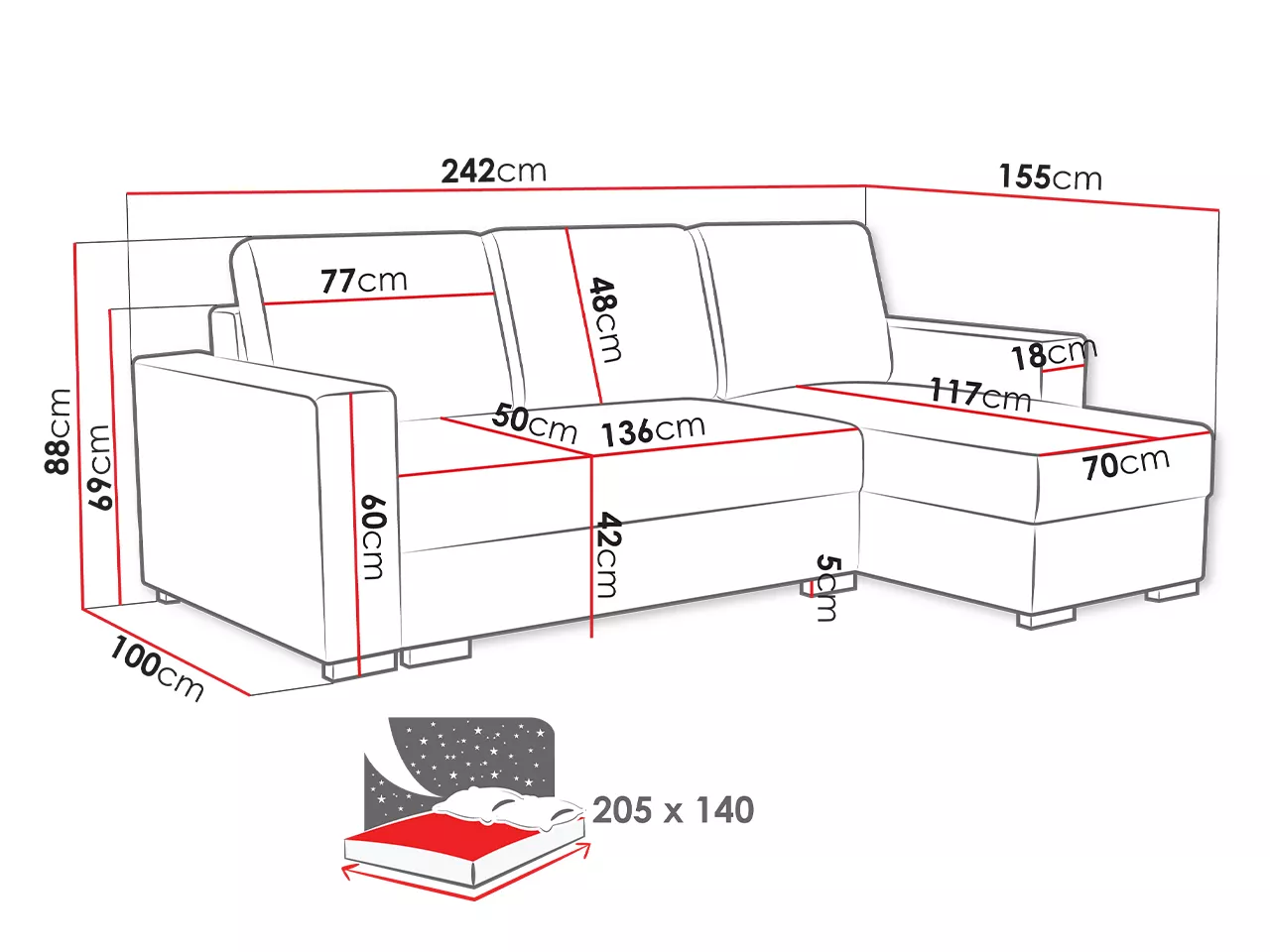 - ložná plocha: 140x205 cm