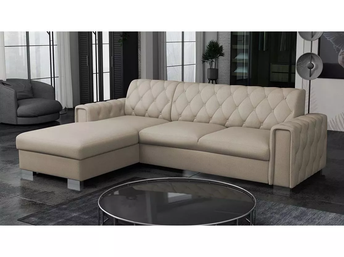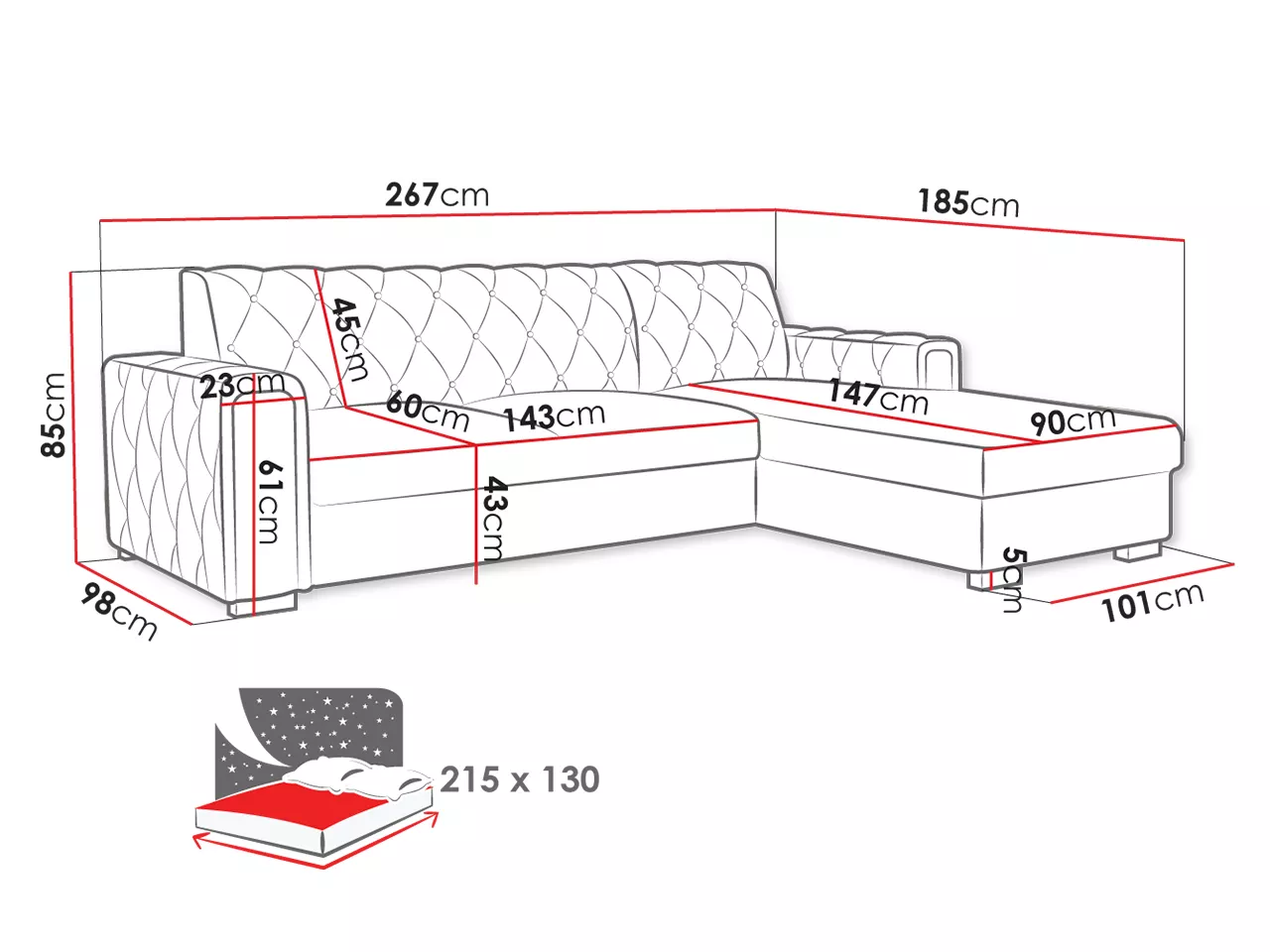 Rohová sedačka JARANA zaujme elegantním prošíváním, které dodává interiéru nádech luxusu. Skvěle se hodí do klasických i moderních prostor. Díky inovativnímu mechanismu lze sedačku snadno a plynule rozložit na pohodlné lůžko o rozměrech 130×215 cm. Praktický úložný prostor poskytne dostatek místa pro lůžkoviny, přikrývky a polštáře.