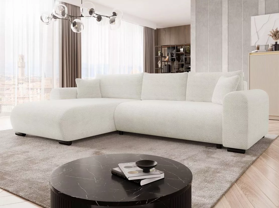 Rohová sedací souprava KANOPE přináší do vašeho domova maximální komfort a funkčnost. Díky rozkládací funkci poskytne prostorné lůžko o rozměrech 135×240 cm, zatímco úložný prostor zajistí místo pro lůžkoviny. Volně ložené opěrné polštáře umožňují maximální komfort při sezení i relaxaci. Sedačku můžete umístit kamkoli v obývacím pokoji a přizpůsobit si prostor podle svých potřeb.