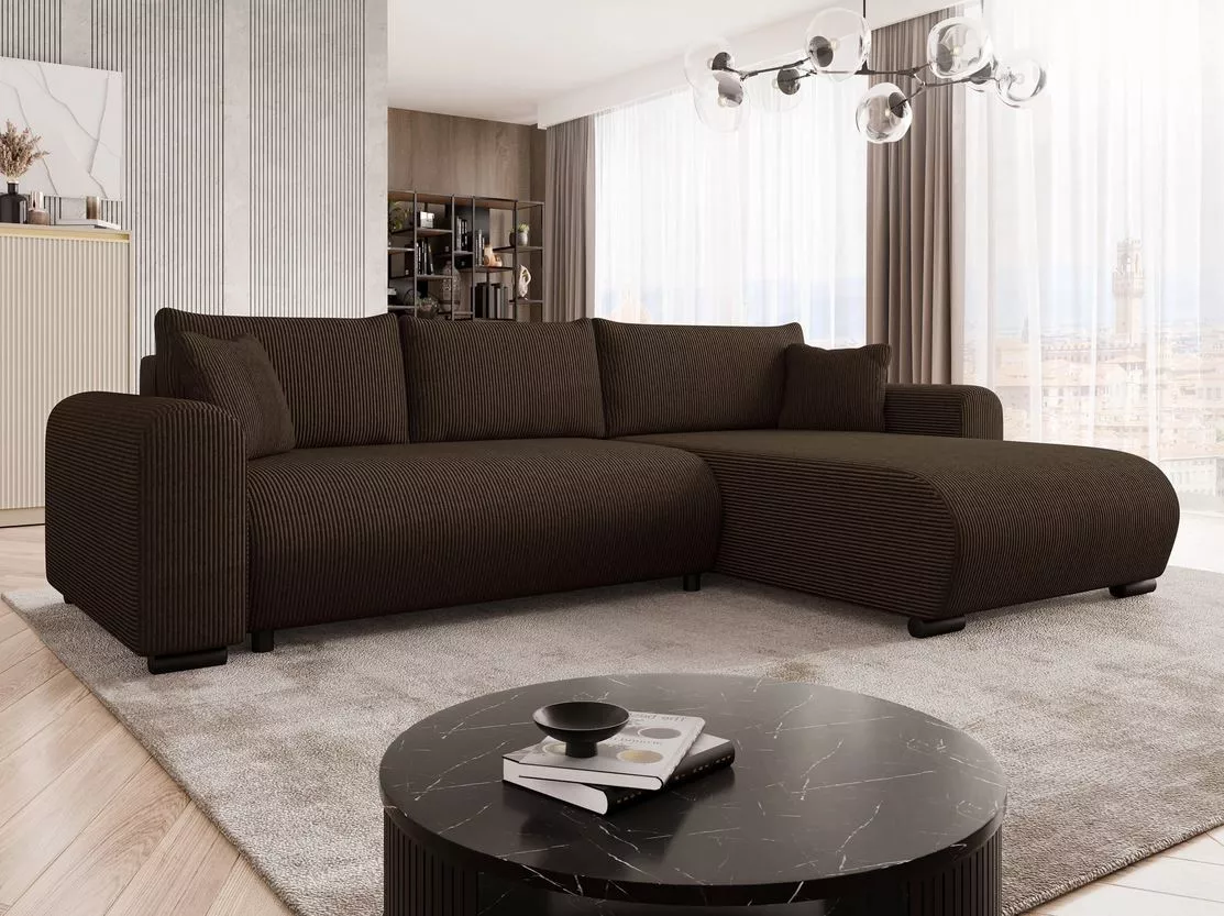Rohová sedací souprava KANOPE přináší do vašeho domova maximální komfort a funkčnost. Díky rozkládací funkci poskytne prostorné lůžko o rozměrech 135×240 cm, zatímco úložný prostor zajistí místo pro lůžkoviny. Volně ložené opěrné polštáře umožňují maximální komfort při sezení i relaxaci. Sedačku můžete umístit kamkoli v obývacím pokoji a přizpůsobit si prostor podle svých potřeb.