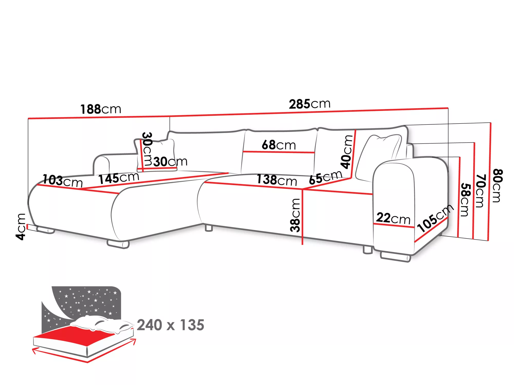 Rohová sedací souprava KANOPE přináší do vašeho domova maximální komfort a funkčnost. Díky rozkládací funkci poskytne prostorné lůžko o rozměrech 135×240 cm, zatímco úložný prostor zajistí místo pro lůžkoviny. Volně ložené opěrné polštáře umožňují maximální komfort při sezení i relaxaci. Sedačku můžete umístit kamkoli v obývacím pokoji a přizpůsobit si prostor podle svých potřeb.