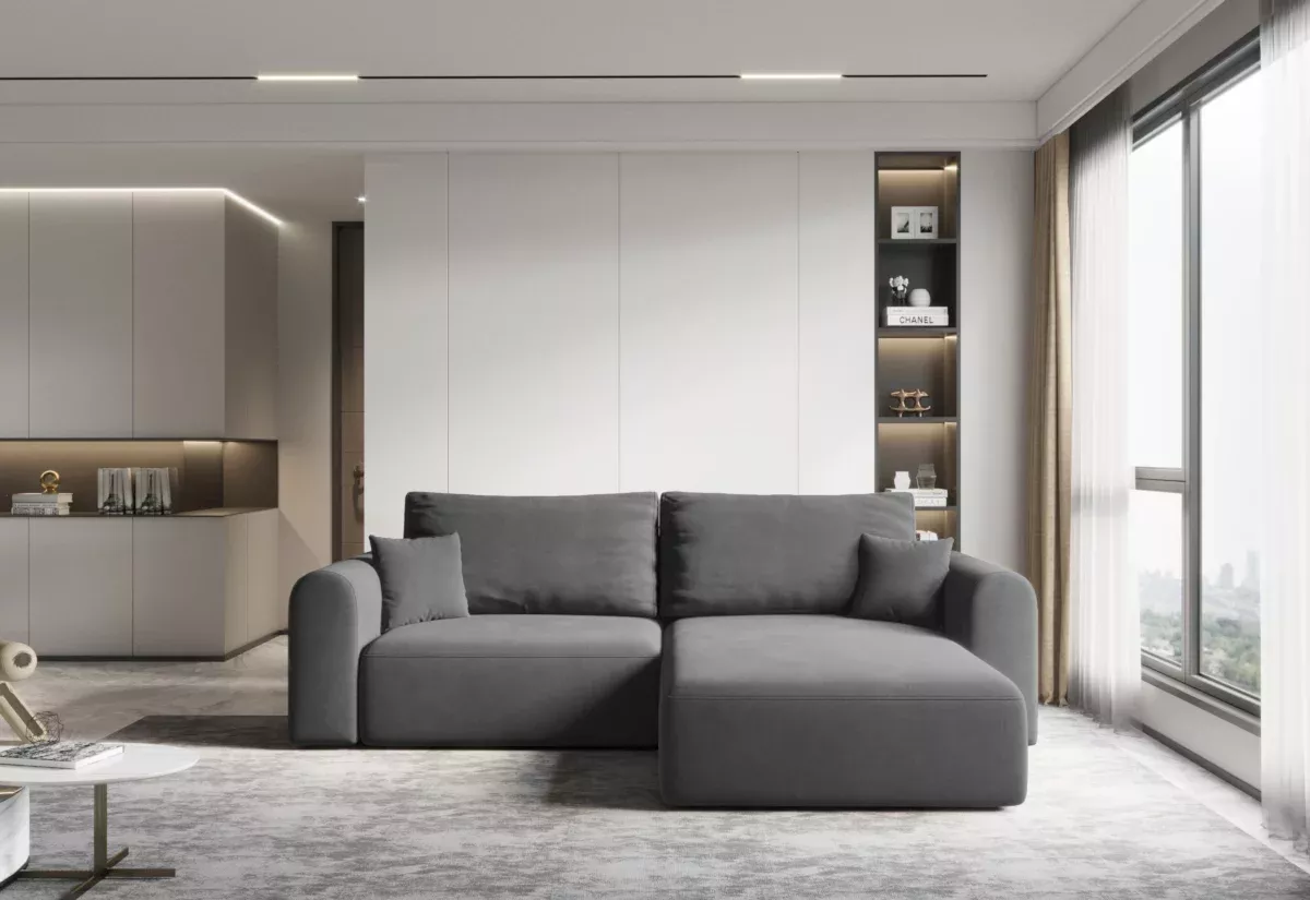Rohová rozkládací sedací souprava ESTEL 1 v sobě spojuje maximální pohodlí s moderním designem, který vynikne v každém interiéru. Je vyrobena z prvotřídních materiálů, které zaručují dlouhou životnost a snadnou údržbu. Jistě oceníte také praktické funkce jako je možnost každodenního spaní na lůžku o rozměrech 122x198 cm a úložný prostor.