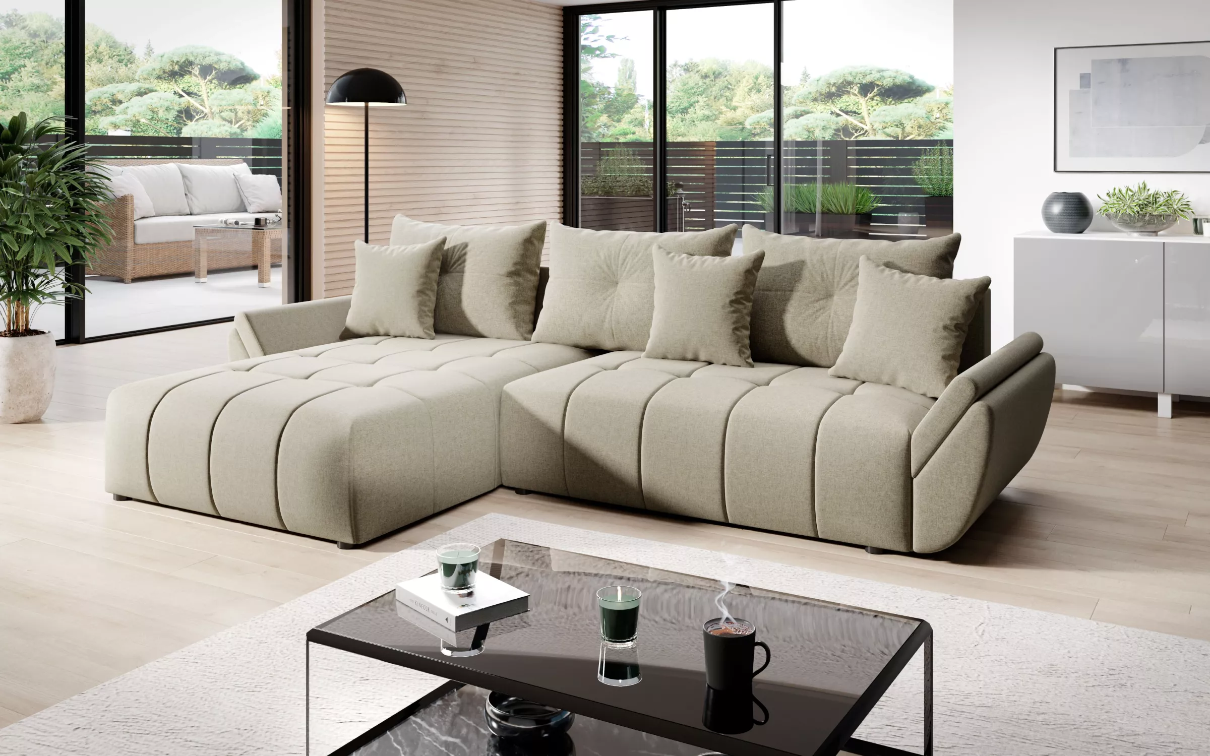 Rozkládací rohová sedačka KASIA vyniká osobitým charakterem s krásnou vizuální stránkou a také vysokou funkčností. Sedačku během pár okamžiků proměníte v pohodlné lůžko o spací ploše 149x230 cm. Disponuje také prostorným úložným prostorem pro uložení lůžkovin nebo sezónního oblečení.