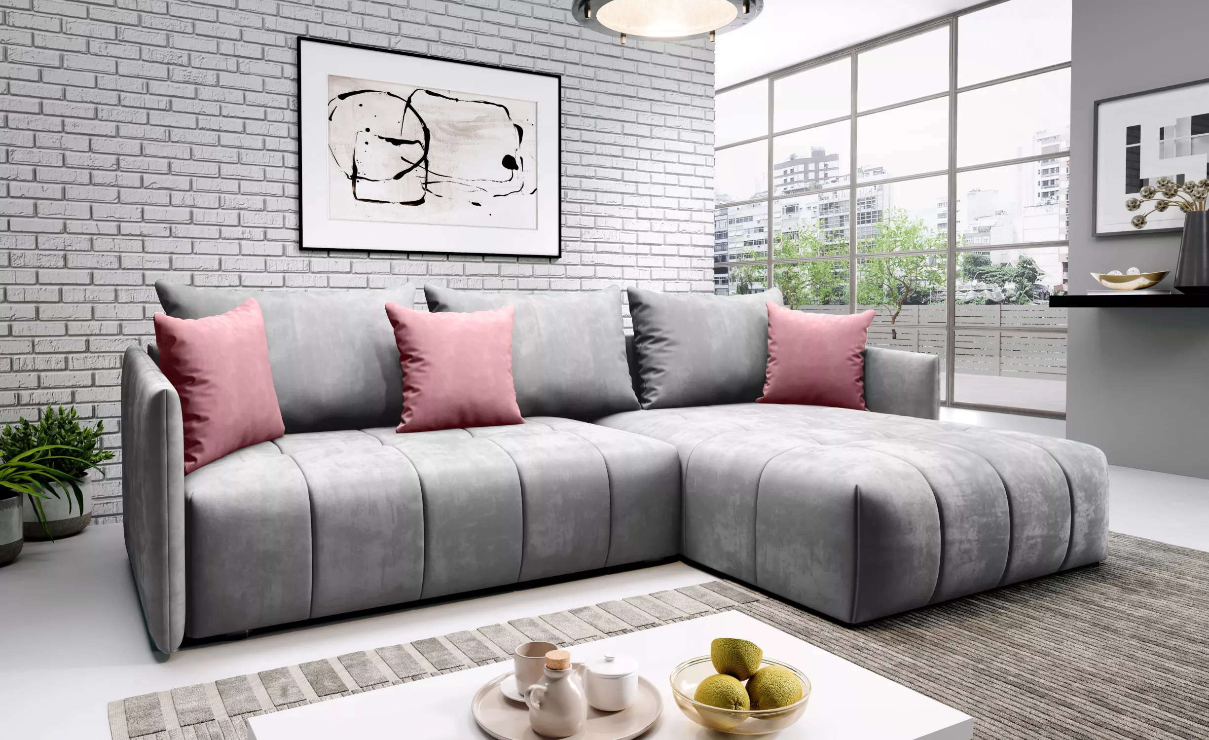 Elegantní rohová sedačka ALBERTINA - světle šedá / růžová