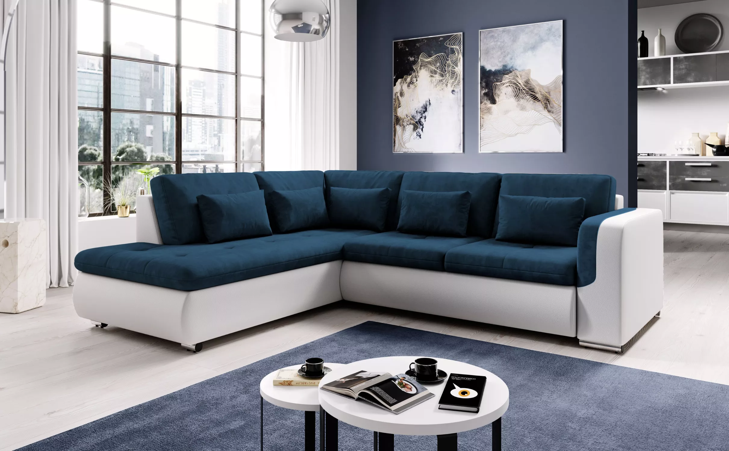 Rohová sedací souprava DAFNI - bílá / modrá, levý roh