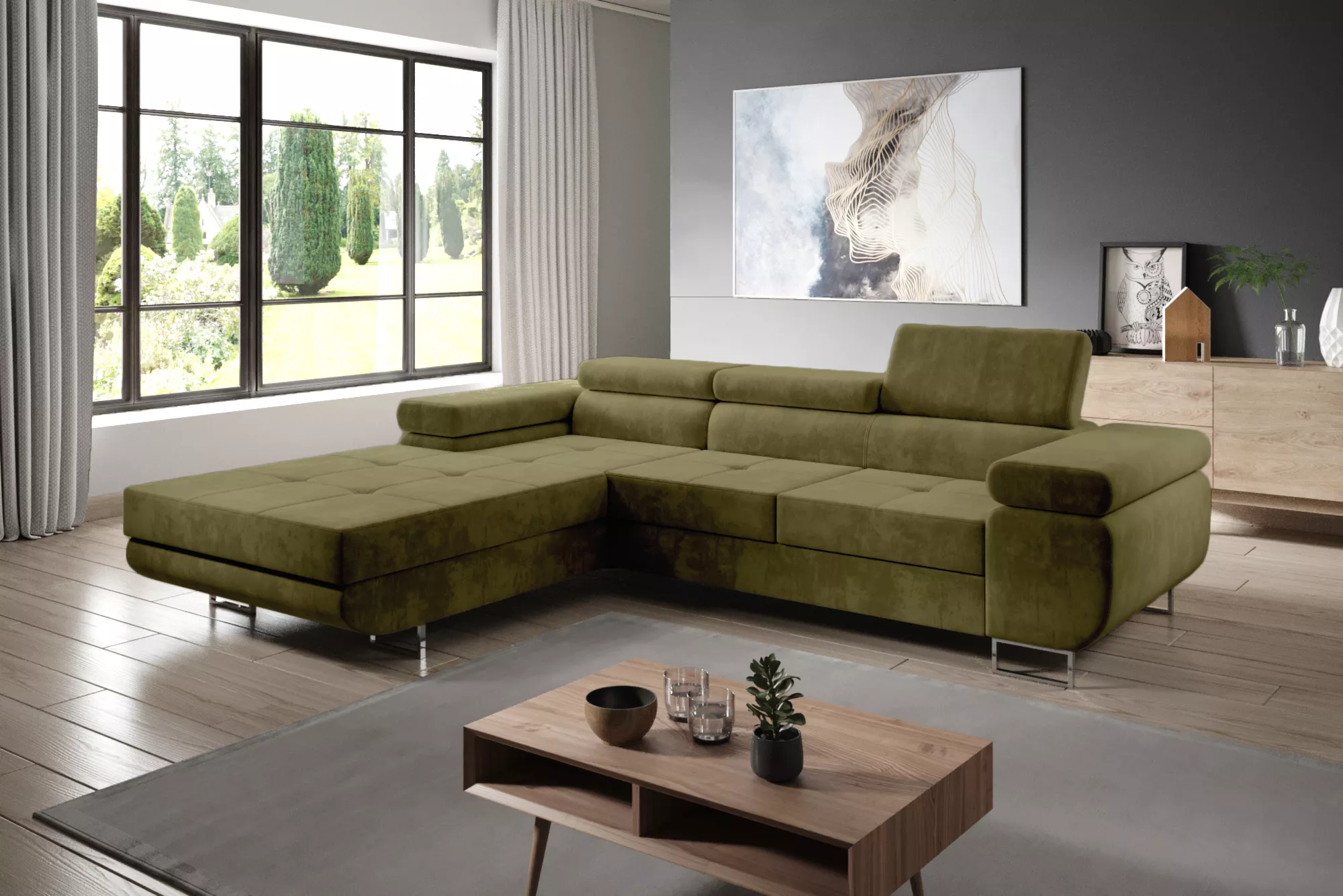 Rohová rozkládací sedací souprava PARASKA - olivová, levý roh
