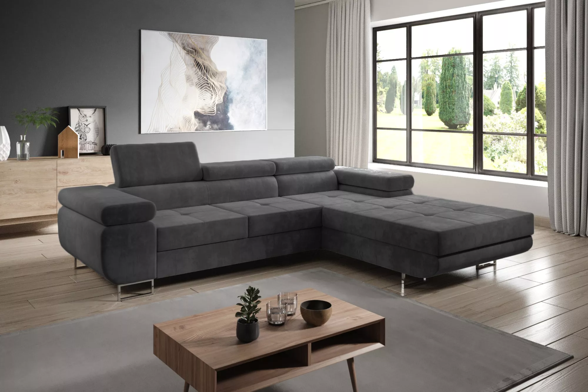 Rohová rozkládací sedací souprava PARASKA se díky nastavitelným opěrkám hlavy a příjemné potahové látce stane dokonalým místem pro odpočinek. Sedačka navíc disponuje rozkládací funkcí na lůžko o rozměrech 125x198 cm a úložným prostorem.
