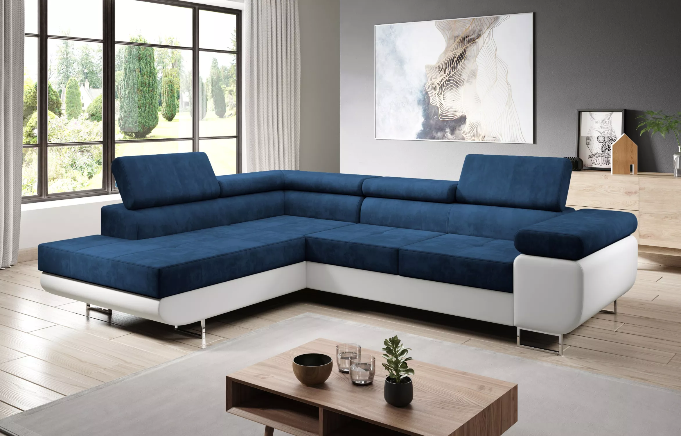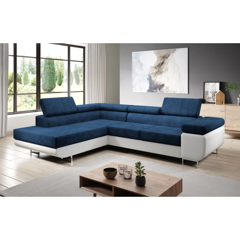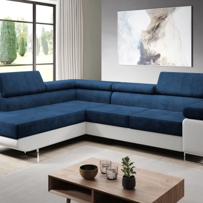 Rozkládací rohová sedačka PARASKA L - bílá / modrá, levý roh