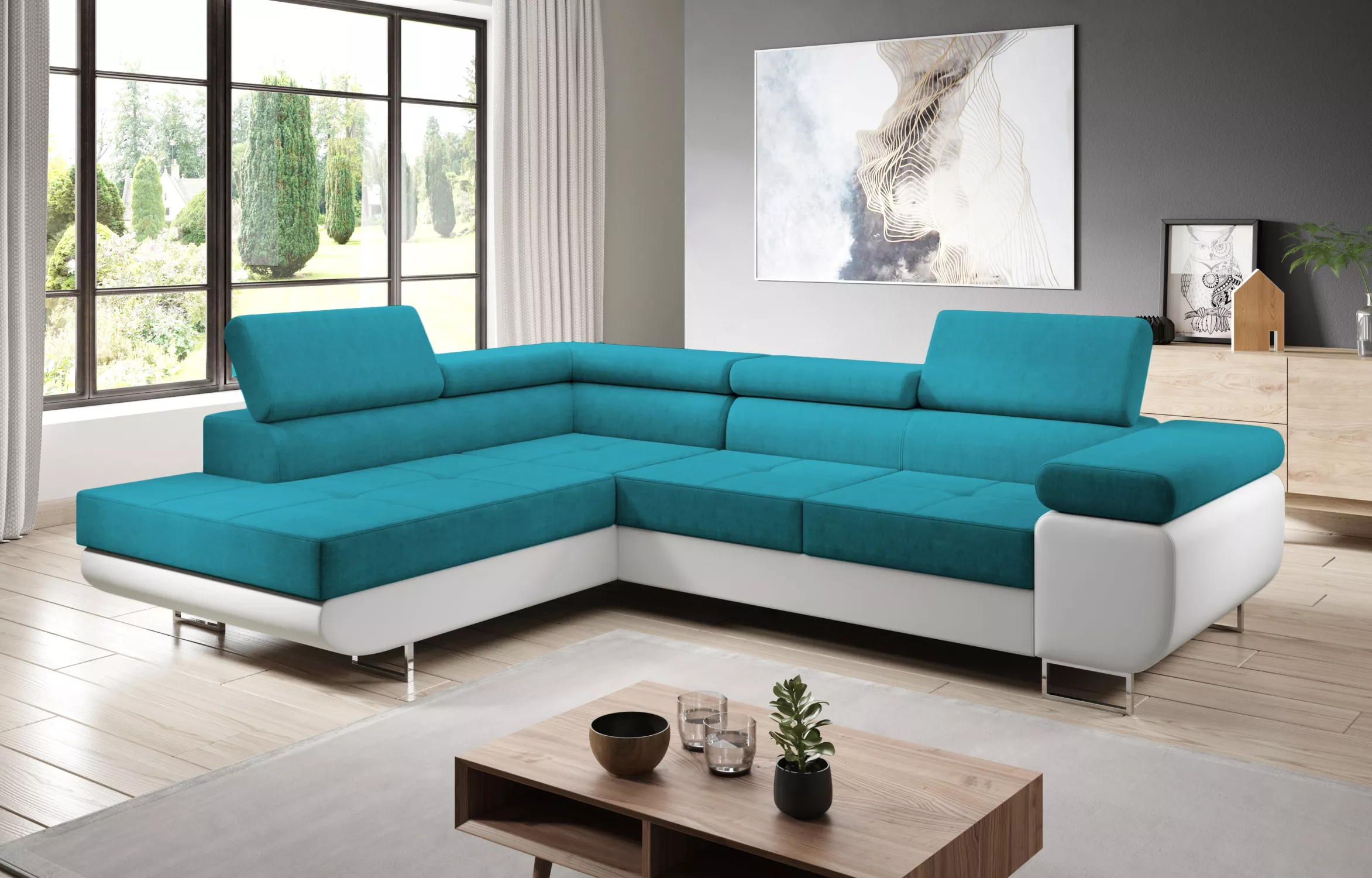 Rozkládací rohová sedačka PARASKA L - bílá / světle modrá, levý roh