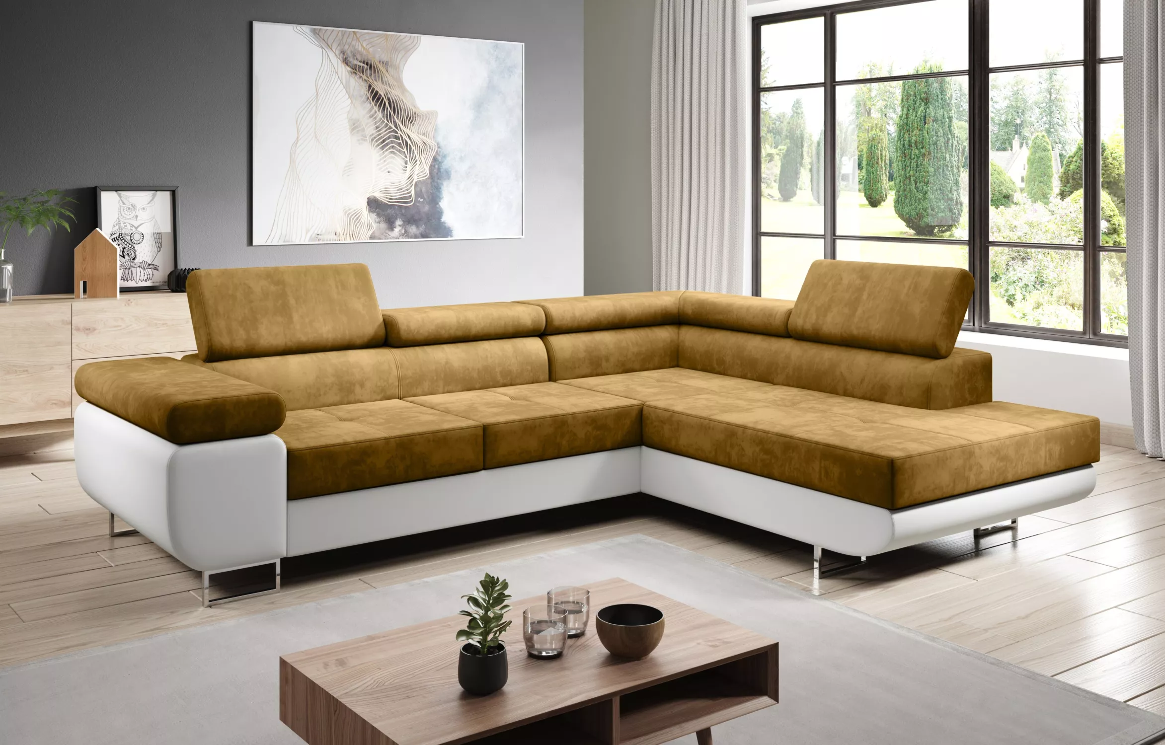Rozkládací rohová sedačka PARASKA L - bílá / hořčicová, pravý roh