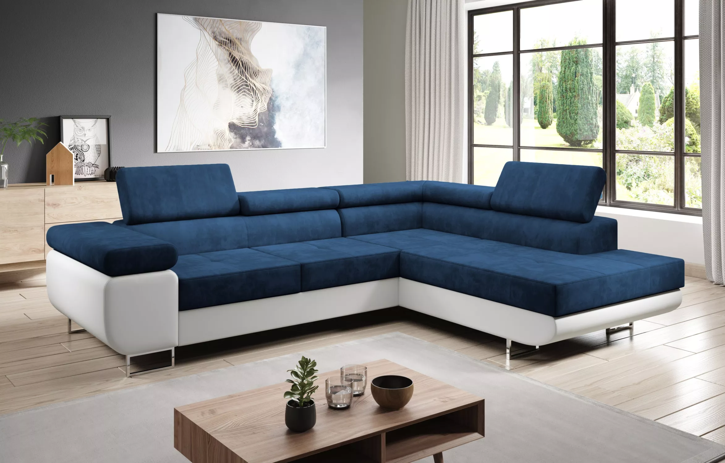 Rozkládací rohová sedačka PARASKA L - bílá / modrá, pravý roh