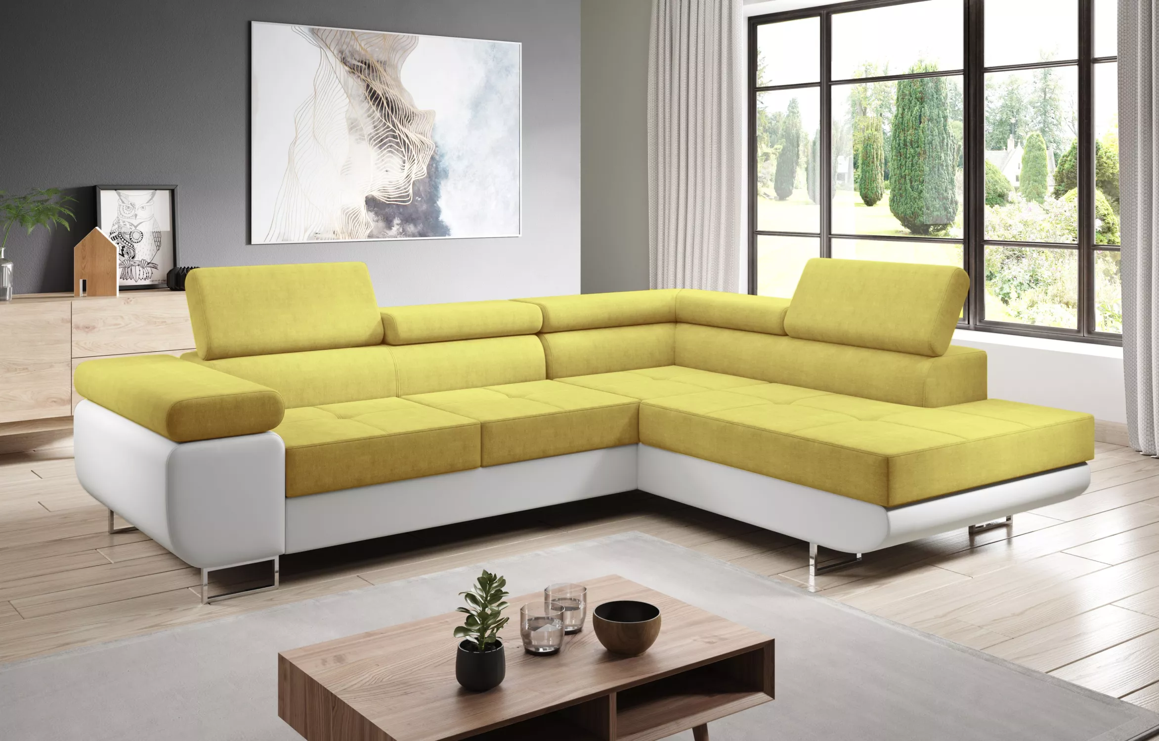 Rozkládací rohová sedačka PARASKA L - bílá / žlutá, pravý roh
