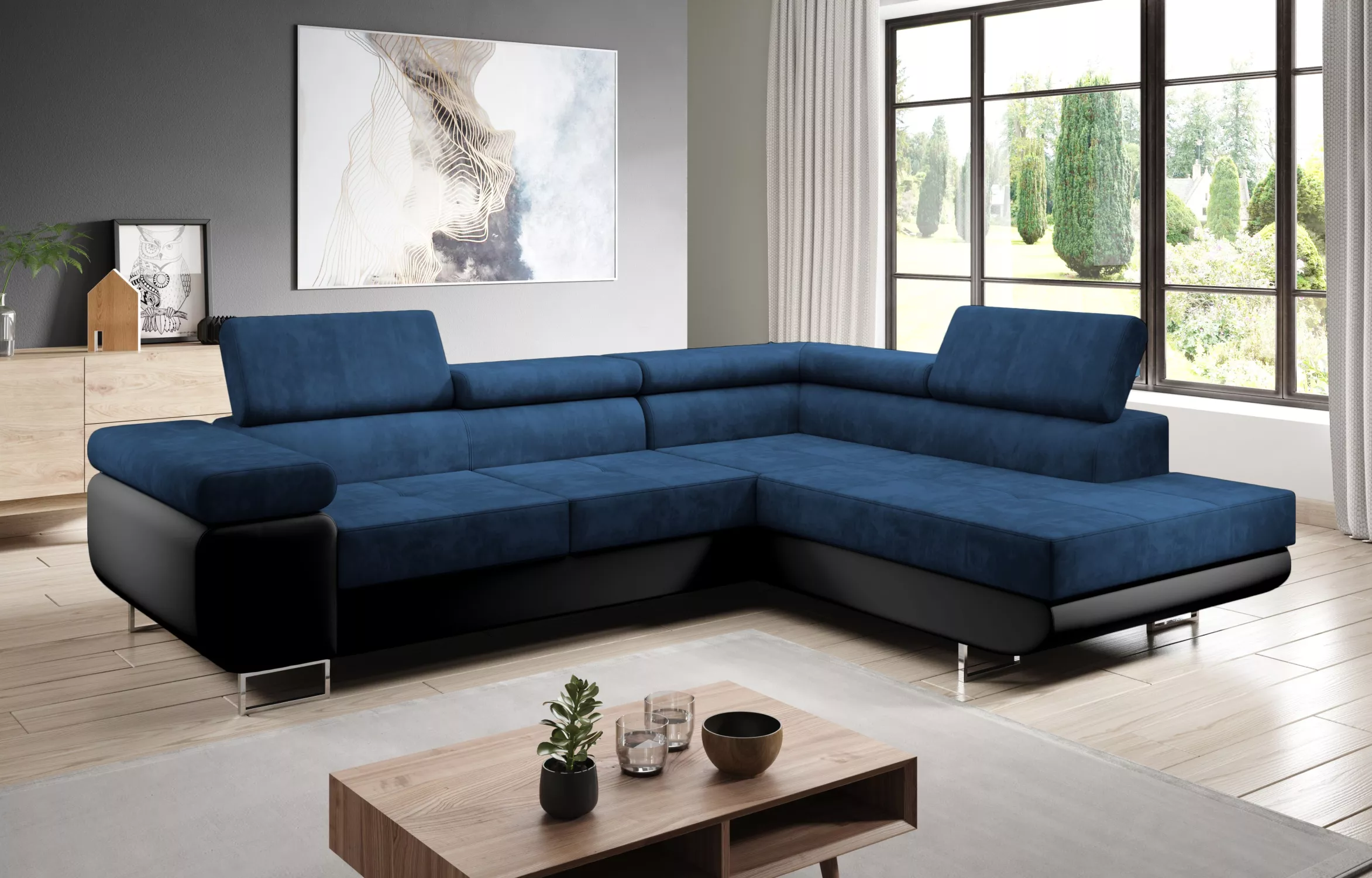 Rozkládací rohová sedačka PARASKA L - černá / modrá, pravý roh