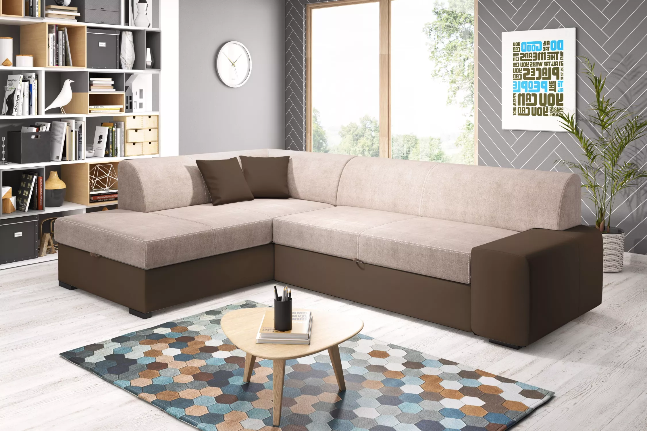 Rohová sedací souprava VALTRUDA díky svým rozměrům a zpracování skvěle zapadne i do menšího obývacího pokoje. Sedačka disponuje rozkládací funkcí na lůžko o rozměrech 135x195 cm a úložným prostorem.